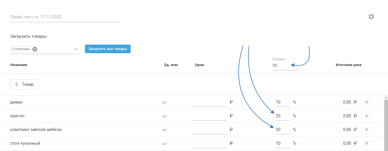 По умолчанию к ценам применяется скидка, можете выбрать наценку. Скидка/наценка применяется в процентах. Вы можете применить общую скидку/наценку ко всем позициям, для этого укажите значение в шапке таблицы, в графе «Скидка/Наценка». Можно задать определённое значение по каждой позиции, для этого укажите значение в ручную: