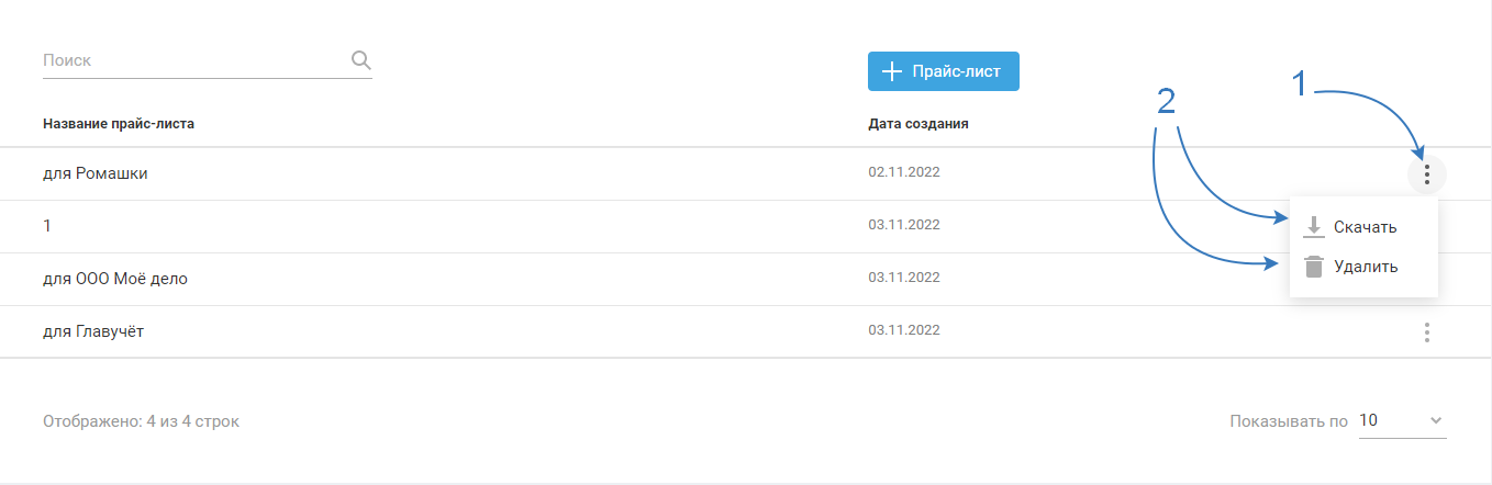 С помощью опций вы можете выполнять следующие действия с прайс-листом: скачивание; удаление.