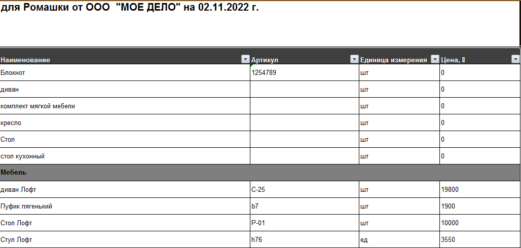 Прайс-лист скачивается из сервиса в формате xls, в таблице формируются графы: Наименование; Артикул; Единица измерения; Цена. Пример файла.