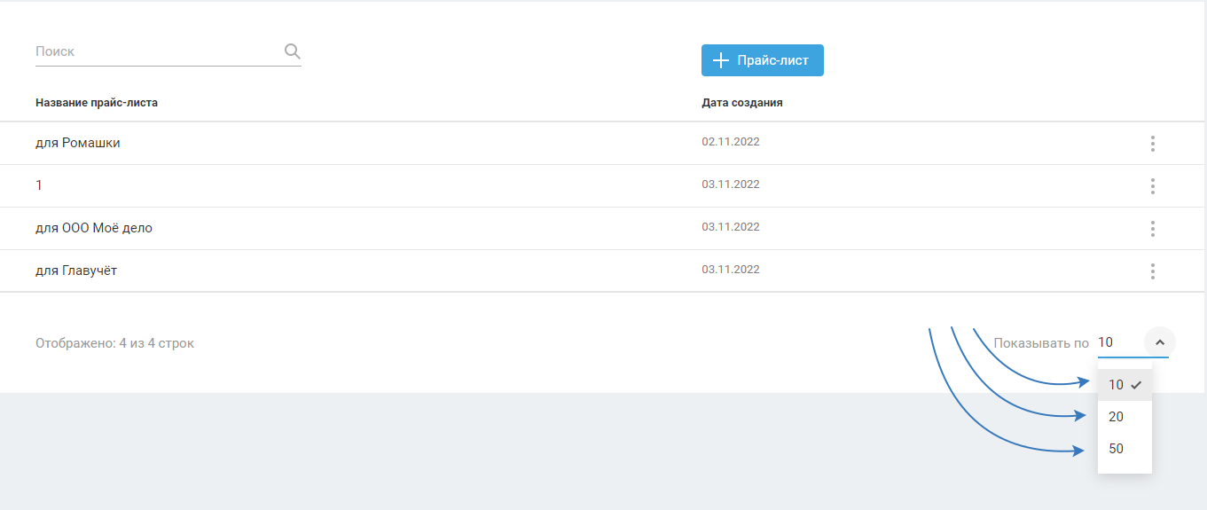 Также для удобства навигации используйте опцию отображения на странице количества строк в таблице с прайс-листами. Для выбора нажмите на значок в виде галки в строке «Показывать по», находящийся в правом нижнем углу: