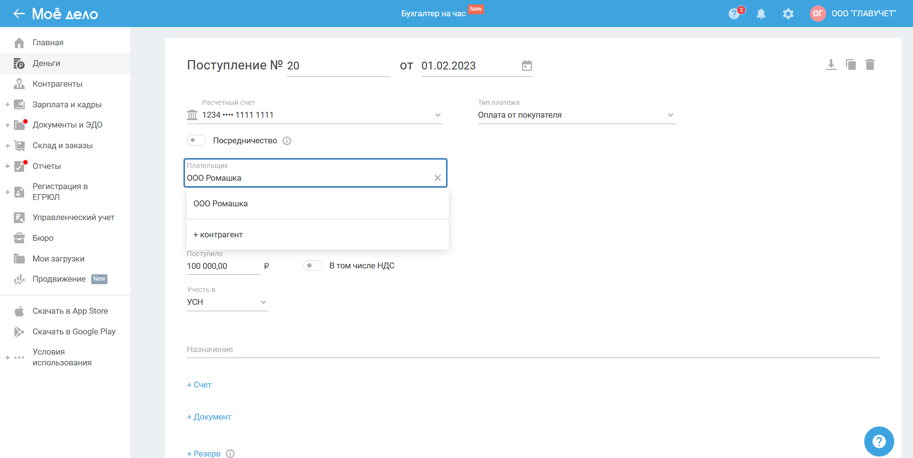 - Проверьте, указан ли один и тот же контрагент в денежной операции и в документе