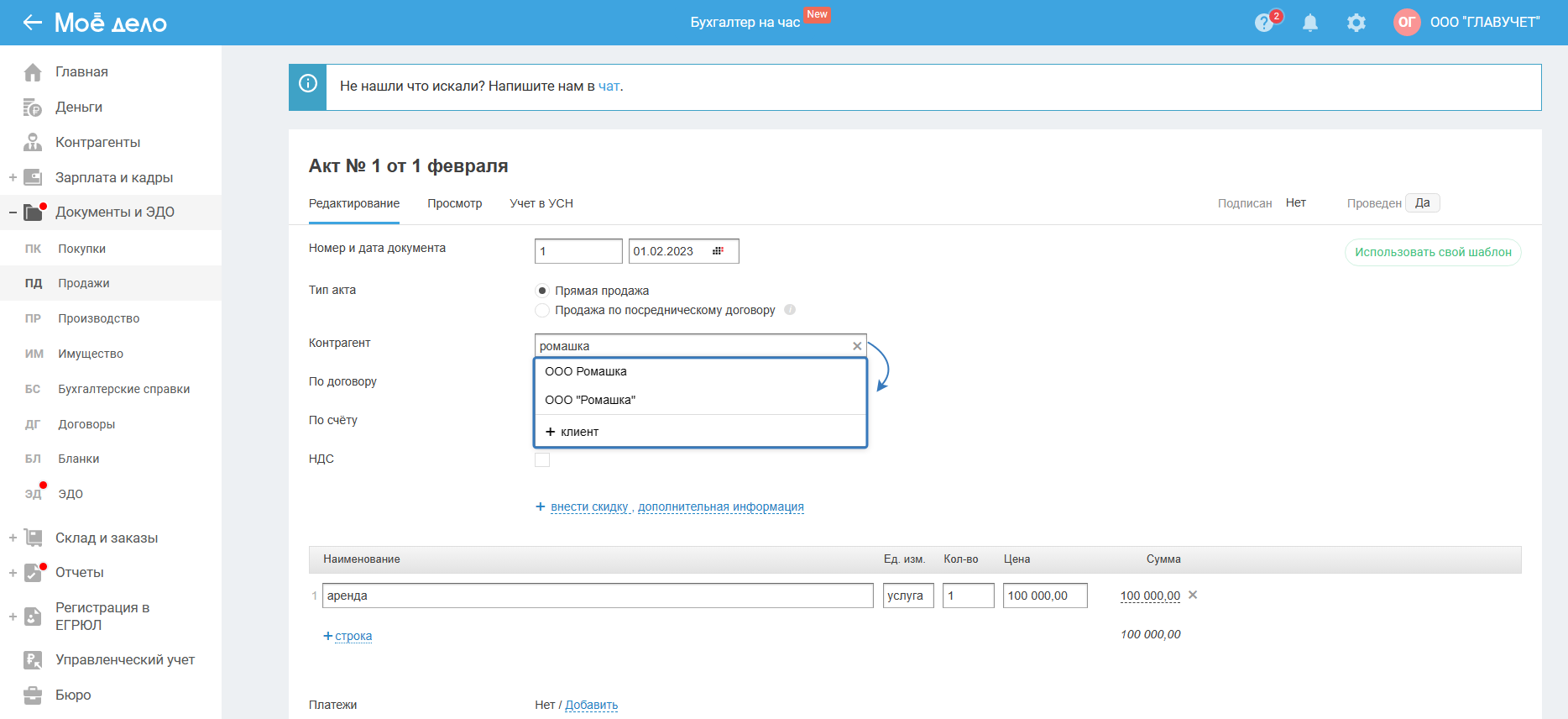 Далее вы создаёте закрывающий документ и в поле «Контрагент» начинаете писать наименование контрагента. В данном случае один контрагент указан без кавычек ООО Ромашка, а другой указан с кавычками ООО «Ромашка». Вам необходимо выбрать того, кто был указан в п/п.