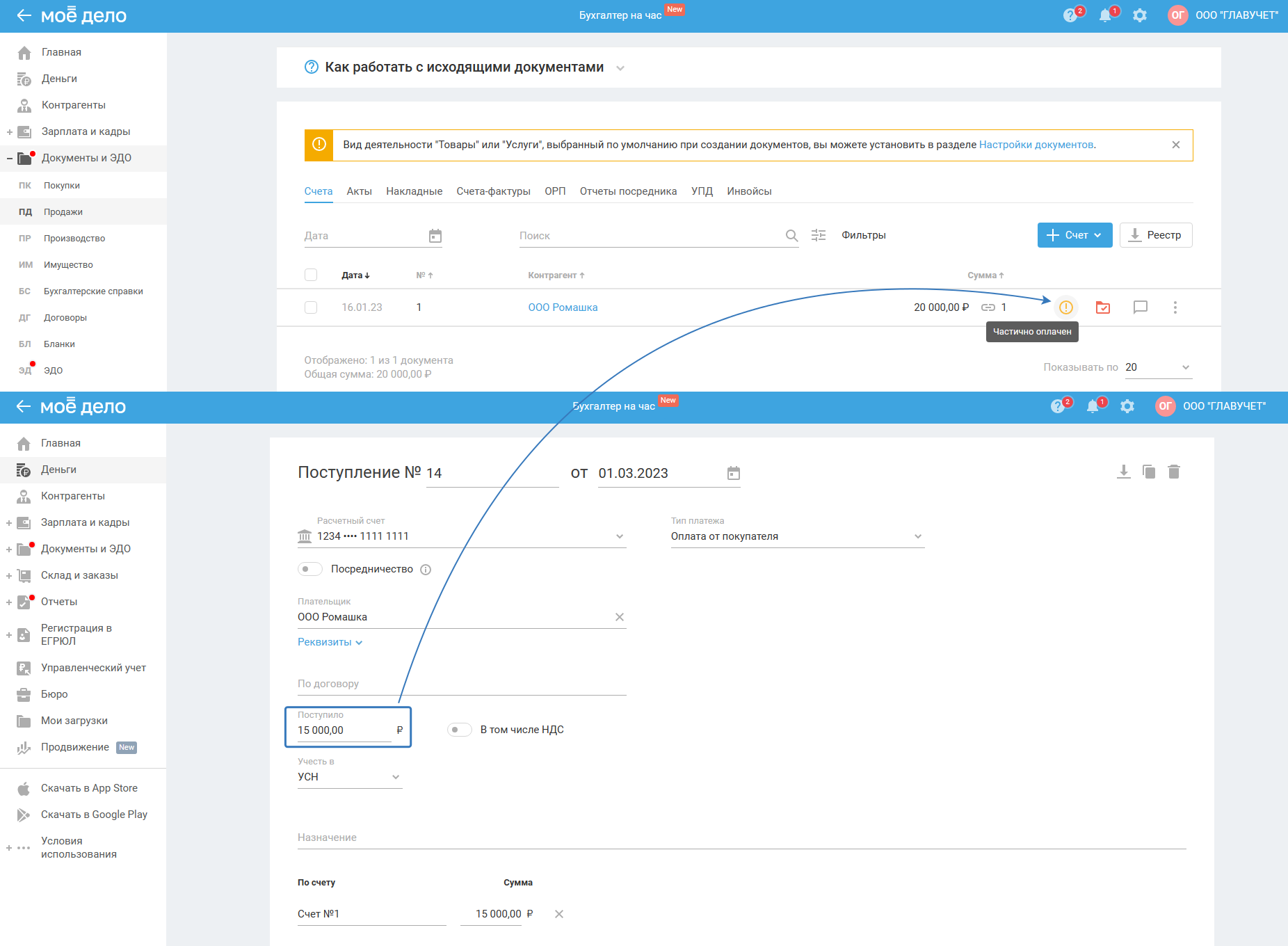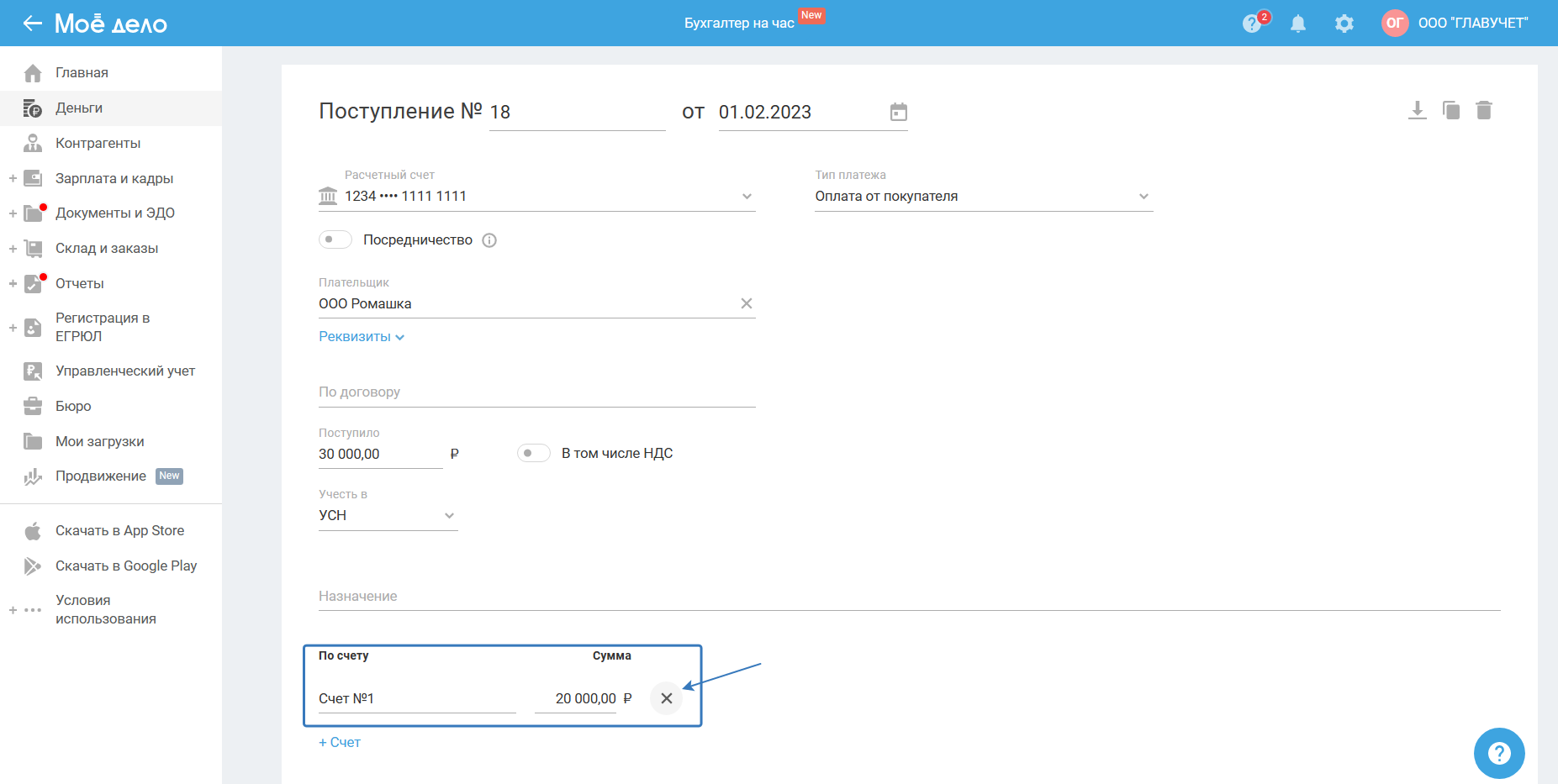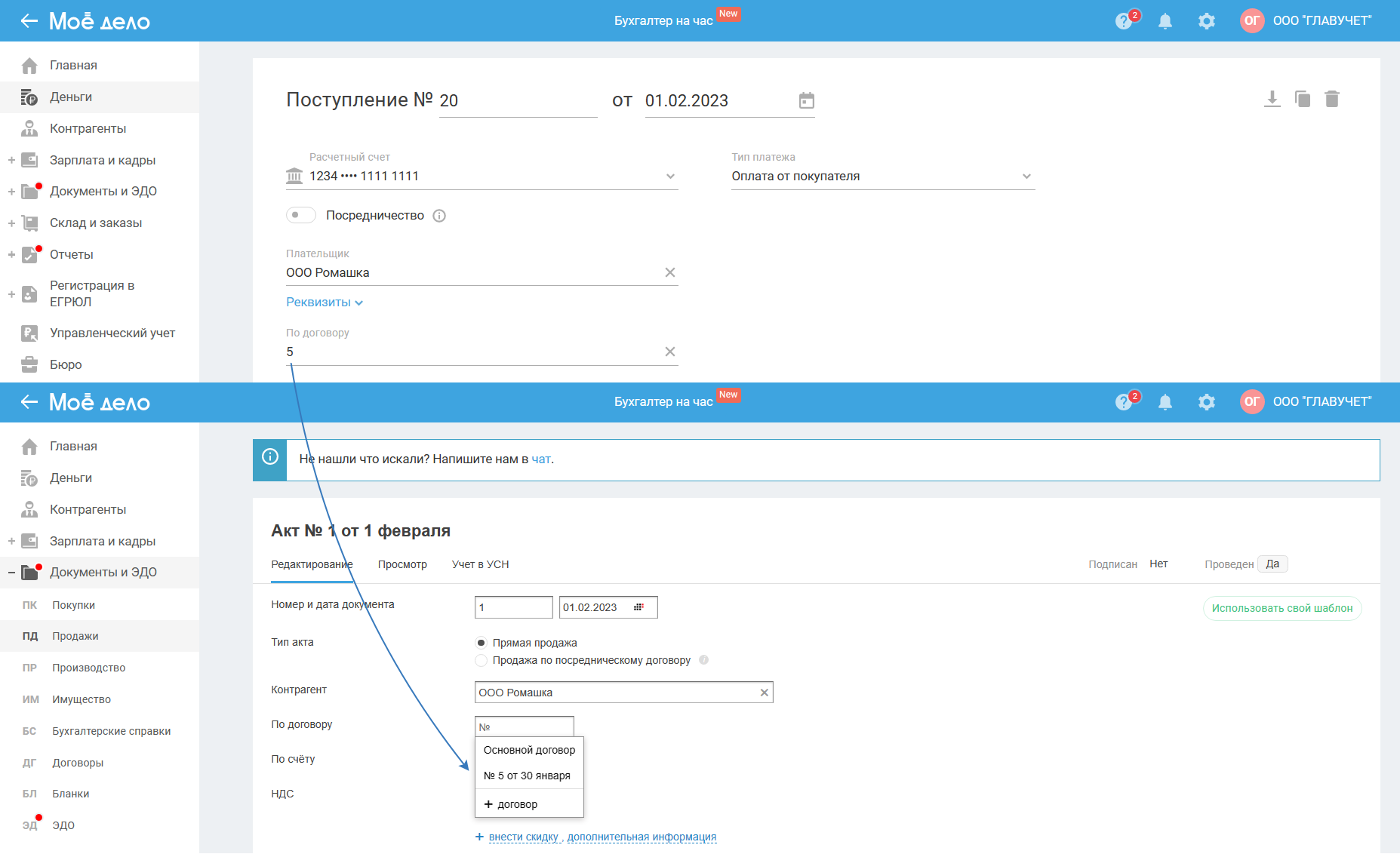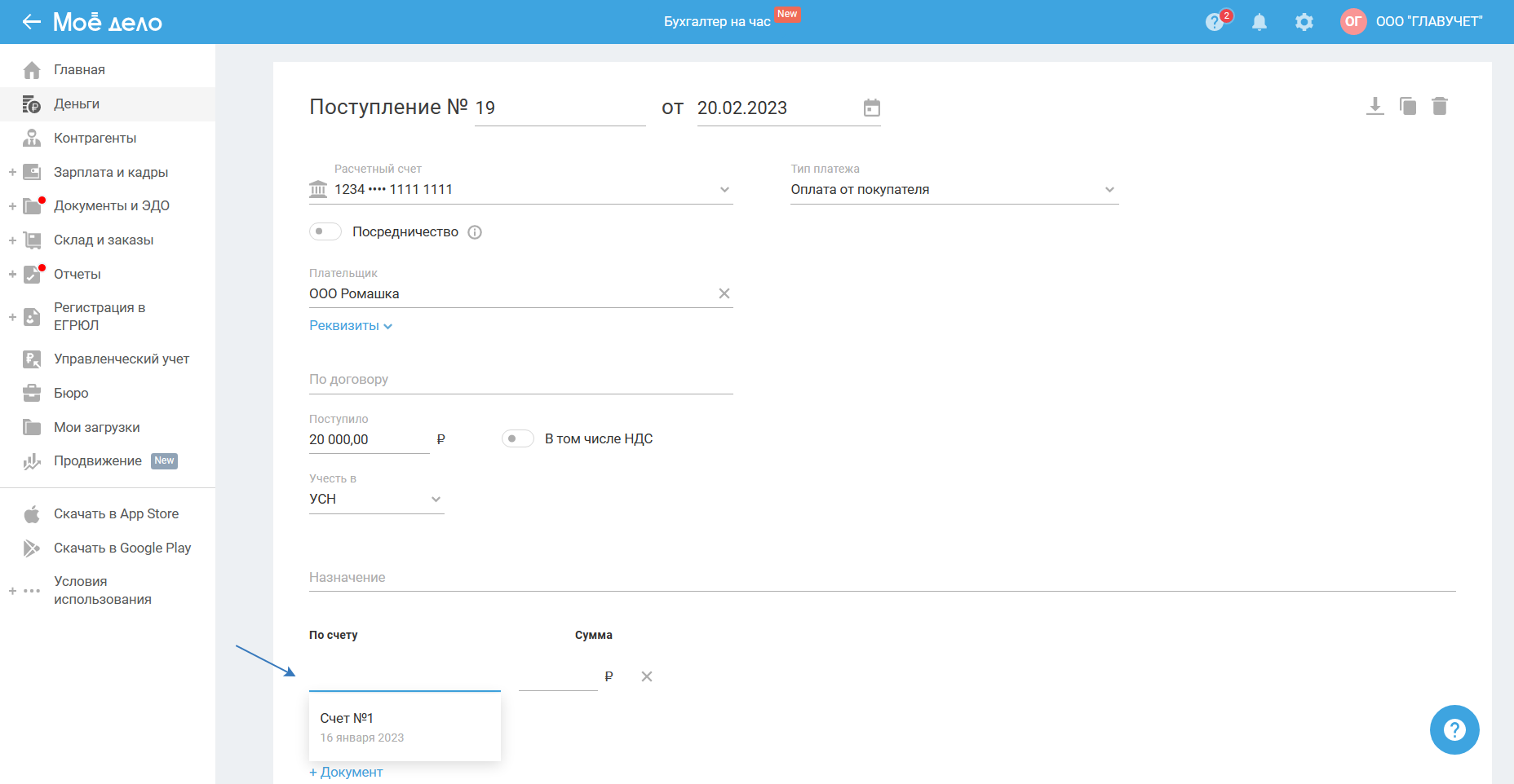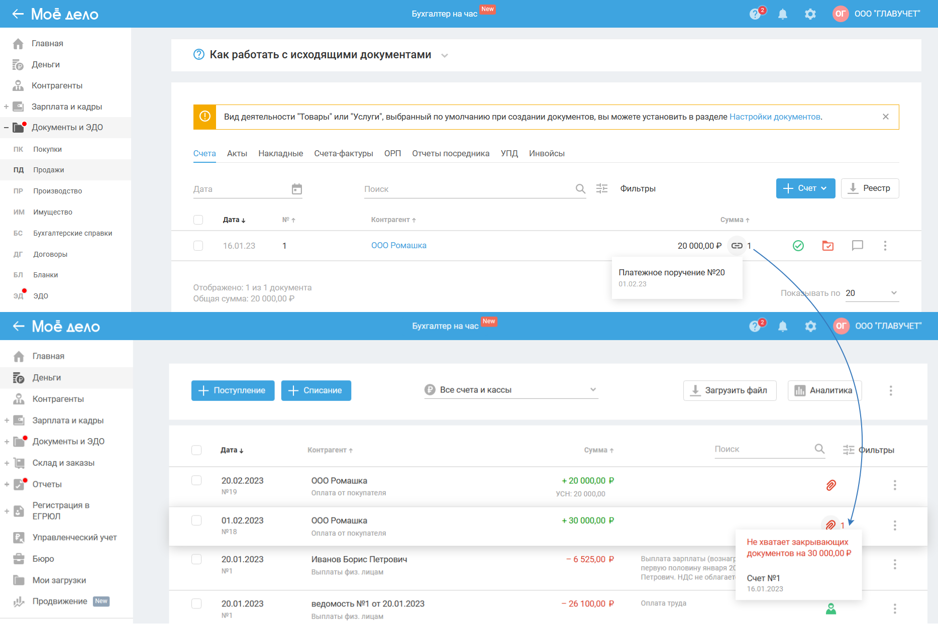 Например, у вас есть счёт для ООО Ромашка на 20 000 руб. В разделе «Деньги» имеются 2 поступления от данного контрагента. Этот счёт относится к п/п № 19 от 20.02.2023 г., но в сервисе он связан с п/п № 18 от 01.02.2023 г.