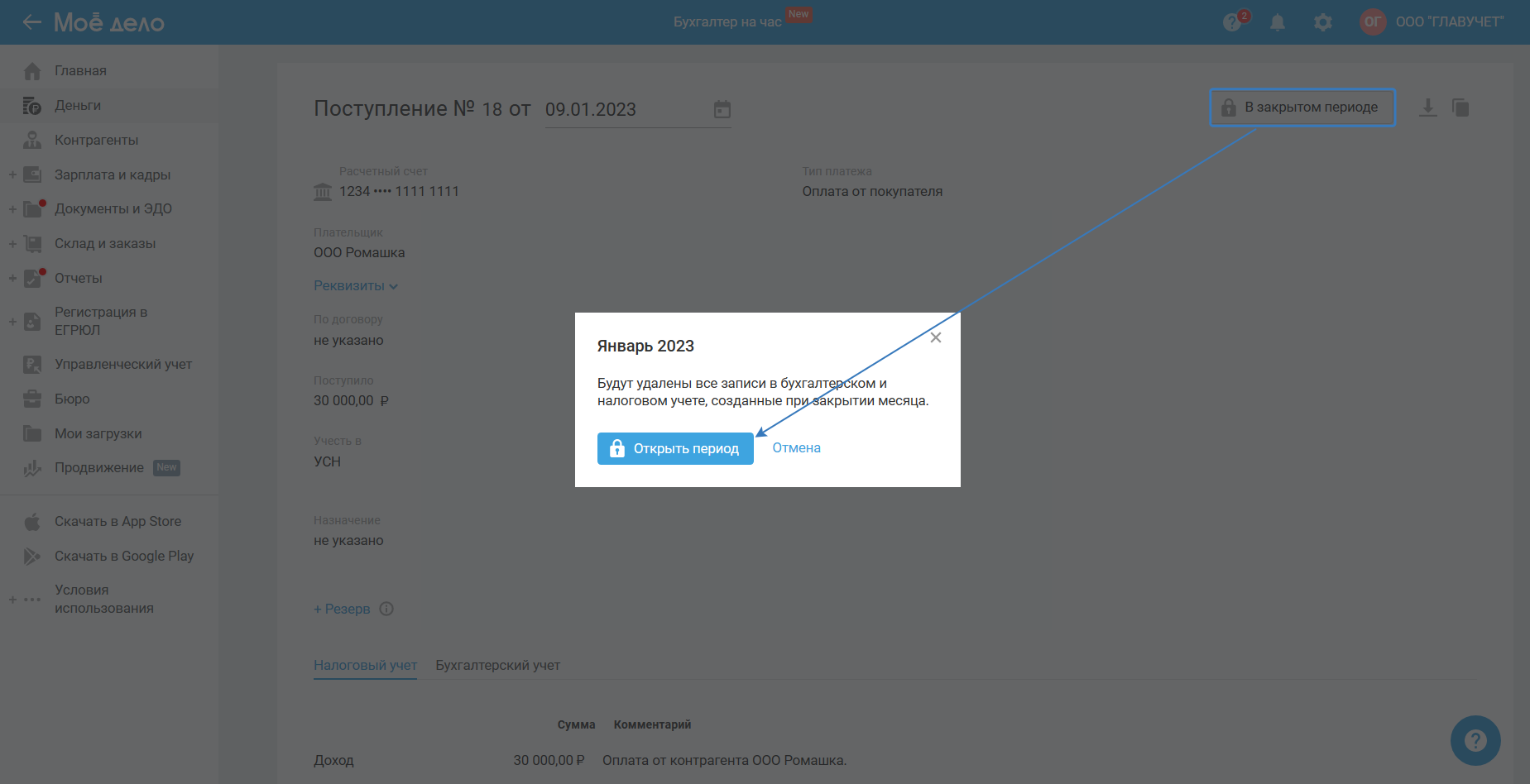 Если денежная операция находится в закрытом периоде, то для привязки к ней счёта/договора, вам необходимо открыть период: