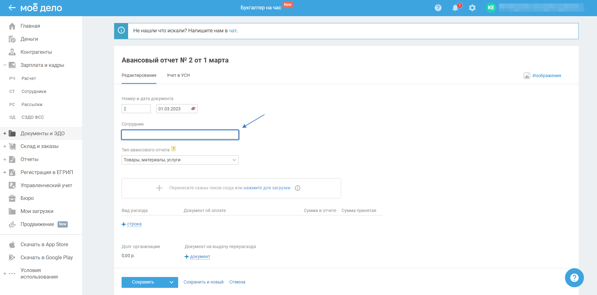 Но при необходимости вы можете создать авансовый отчёт. Однако это исключительно технический вариант отражения расходов в сервисе, который имеет свои риски при налоговых проверках. В сервисе это допускается только для удобства пользователей, но не для того, чтобы составленный авансовый отчёт использовать как подтверждающий документ на расходы. Его не нужно распечатывать и хранить в документах ИП, он будет отражаться только в сервисе.