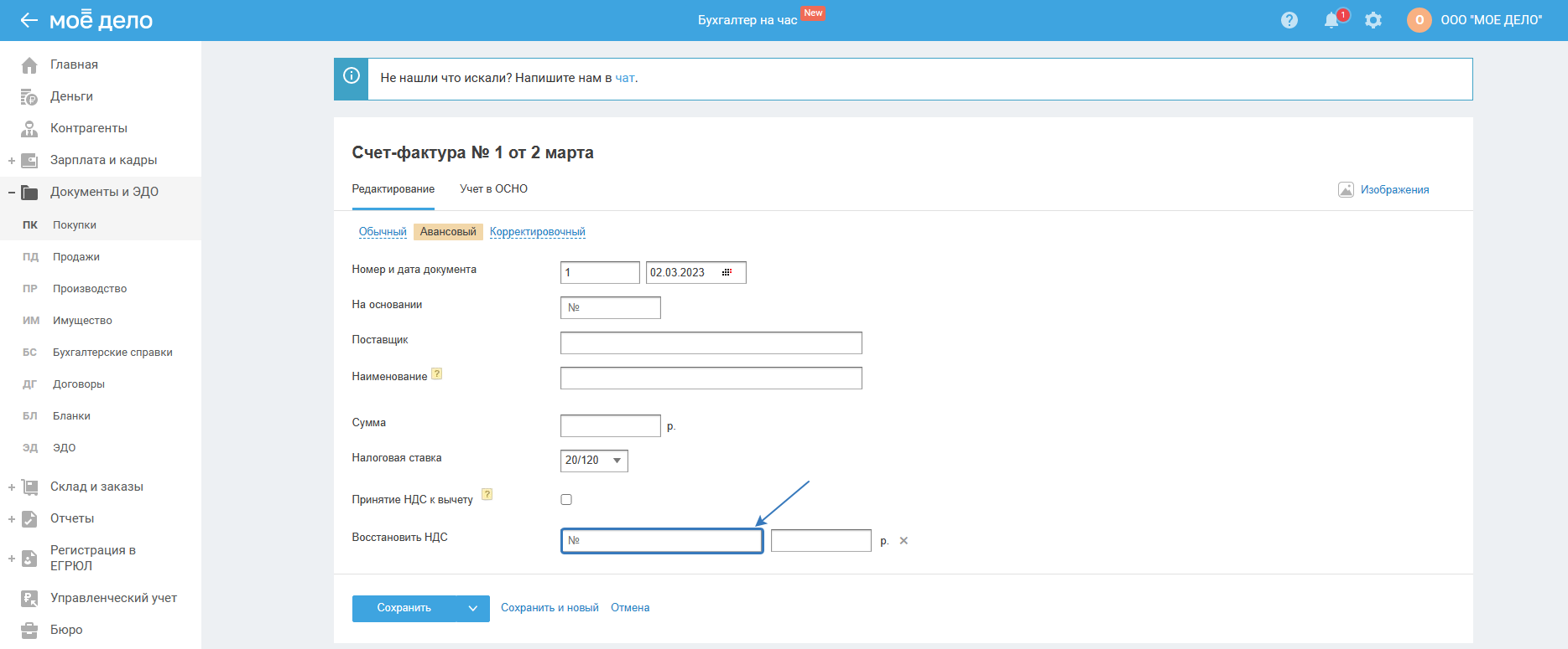 В строке «Восстановить НДС» из выпадающего списка выберите счёт-фактуру/УПД: