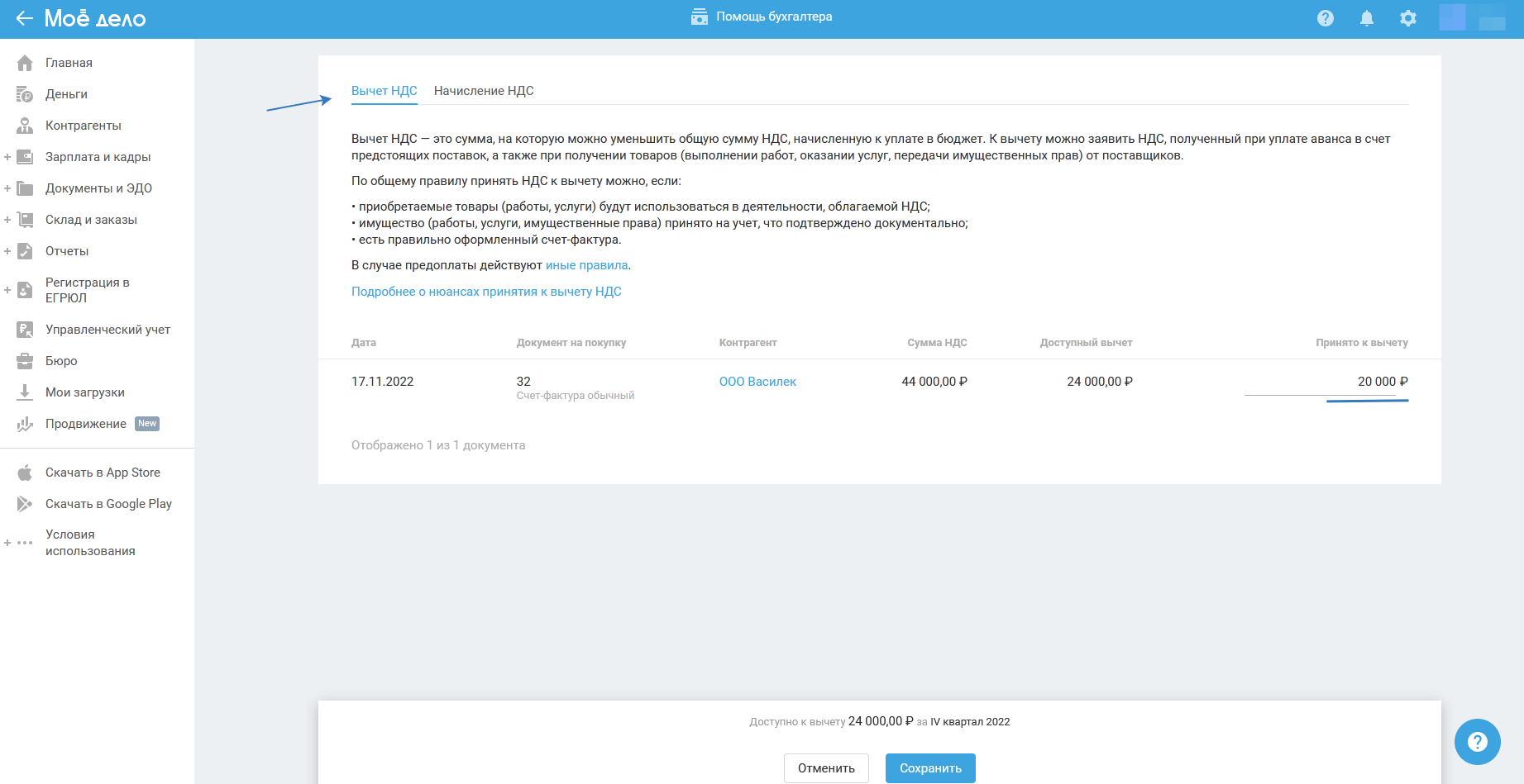 Если получилась сумма к возмещению, т.е. сумма вычета НДС превысила сумму начисленного налога, то в виджете НДС на главной странице нажмите «Принять к вычету».