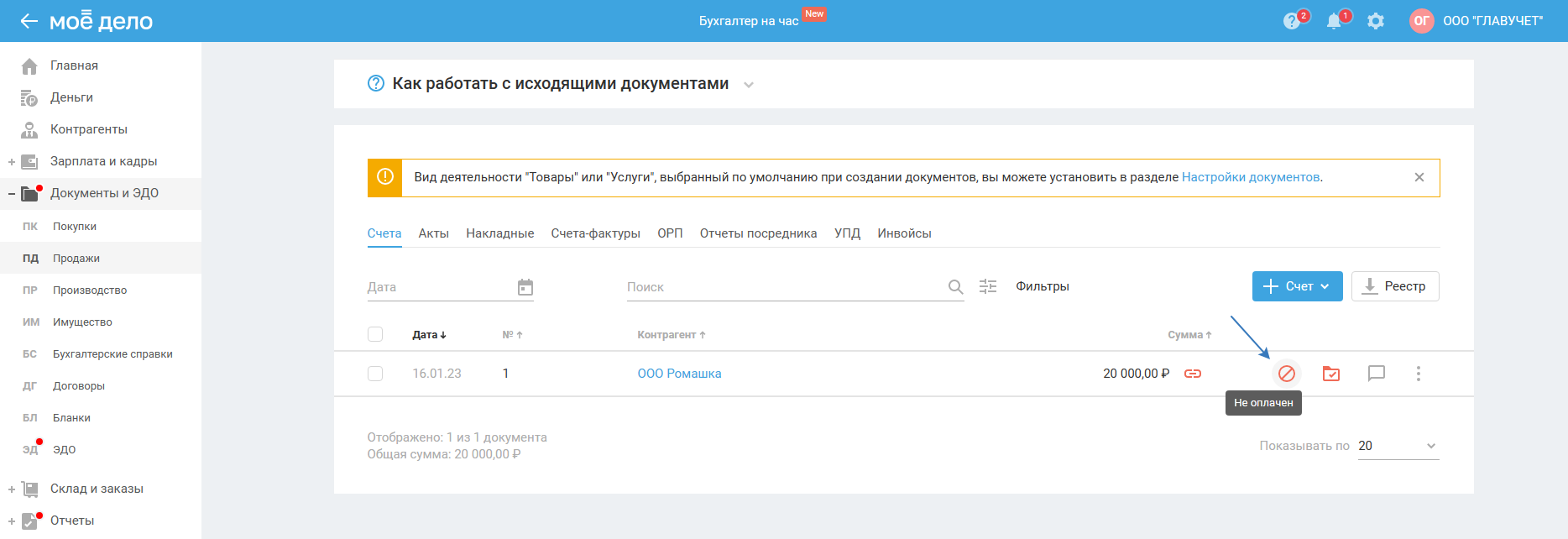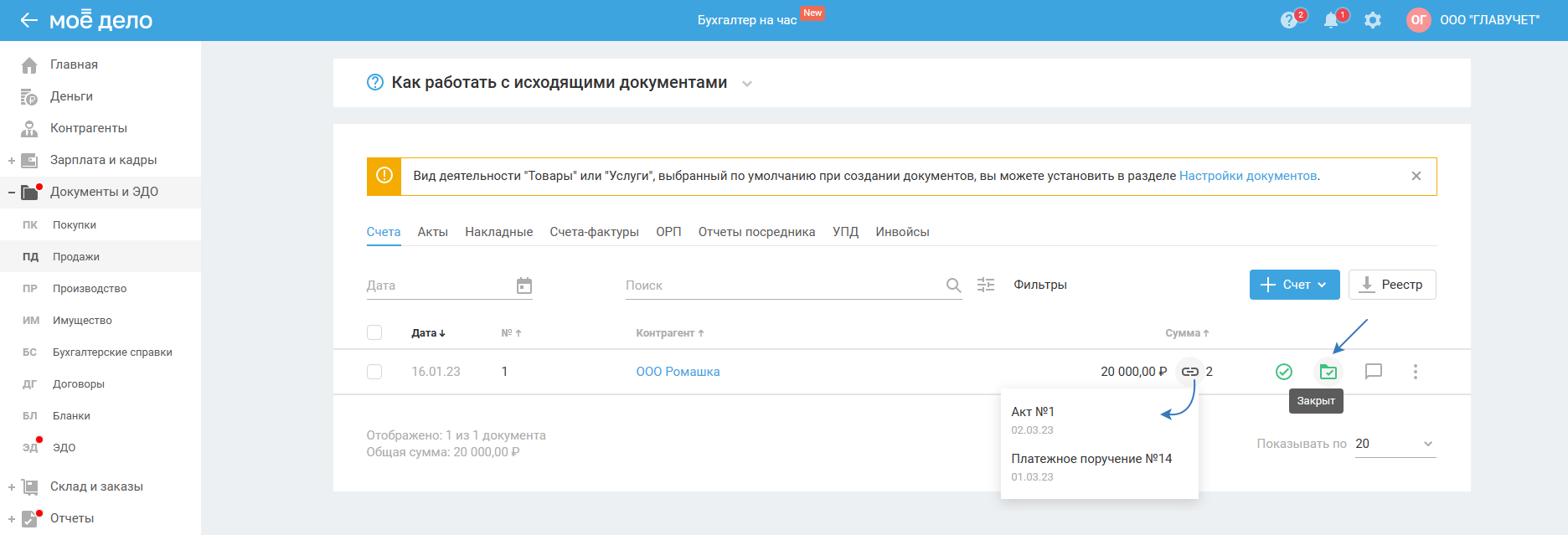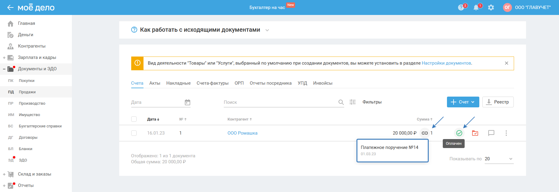 Далее в разделе «Документы» счёт поменяет статус, а по скрепке вы увидите связанный документ: