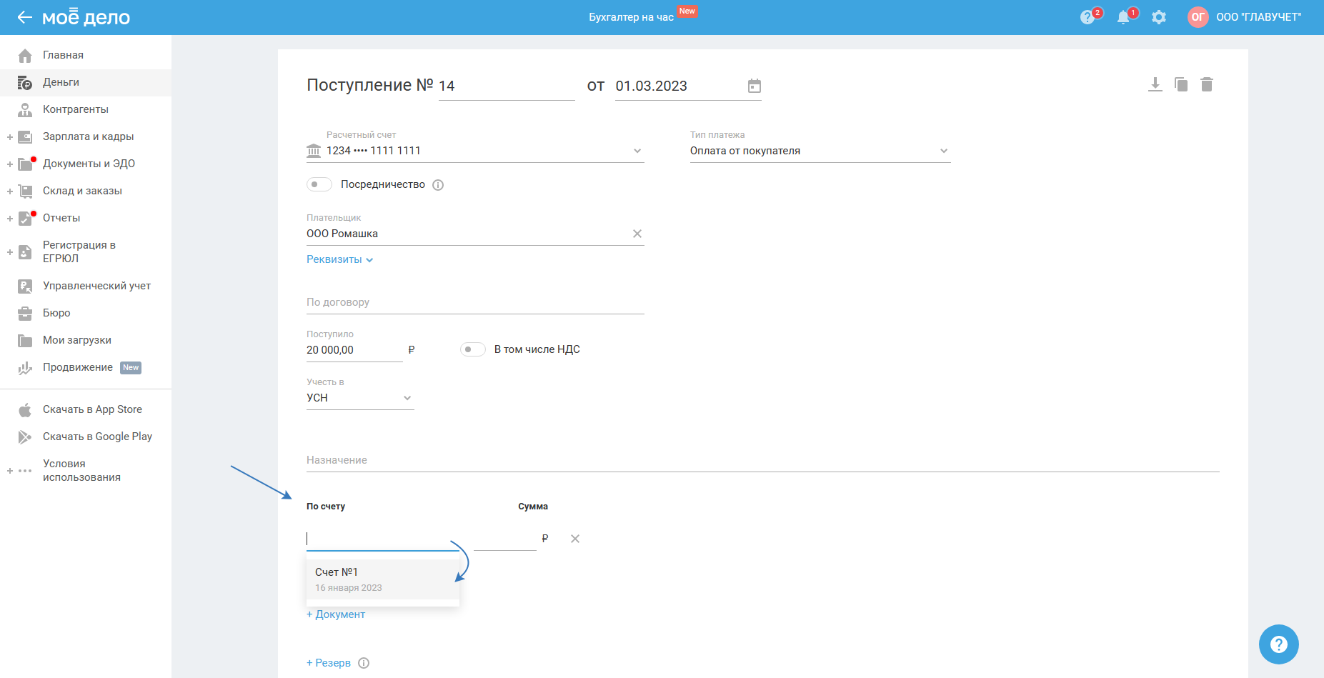 Затем открыть нужную денежную операцию и привязать к ней счёт.