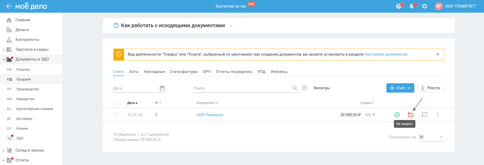 Если у счёта нет закрывающего документа, статус будет «Не закрыт»: