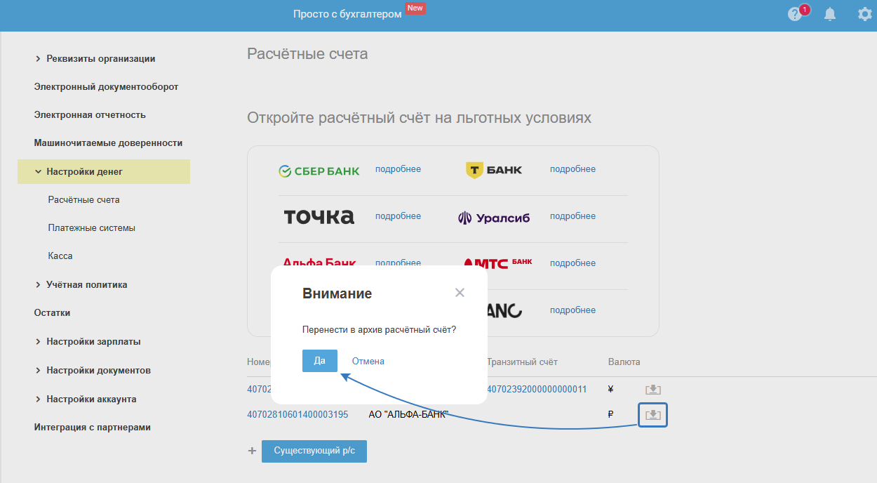 Транзитный и расчётный валютные счета работают в паре и переносятся в архив / удаляются оба одновременно. Опция удаления валютного счёта доступна, если по нему нет операций в разделе «Деньги» и по нему не заполнены остатки.