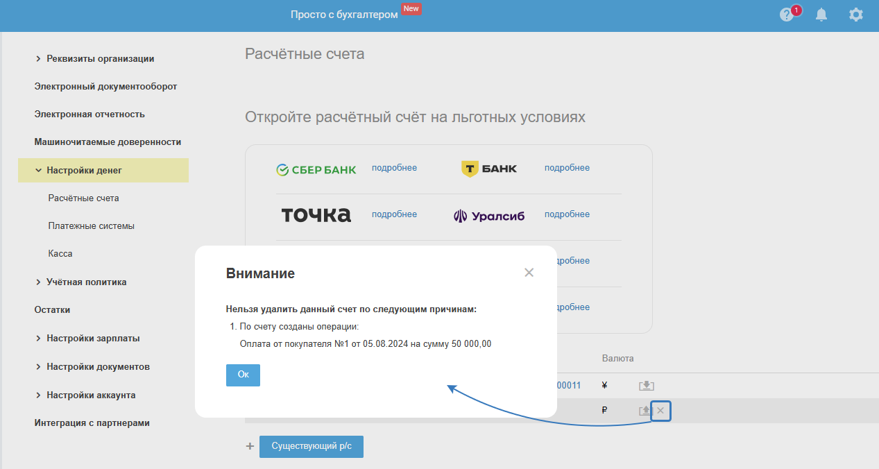 Счёт удалить нельзя, если: