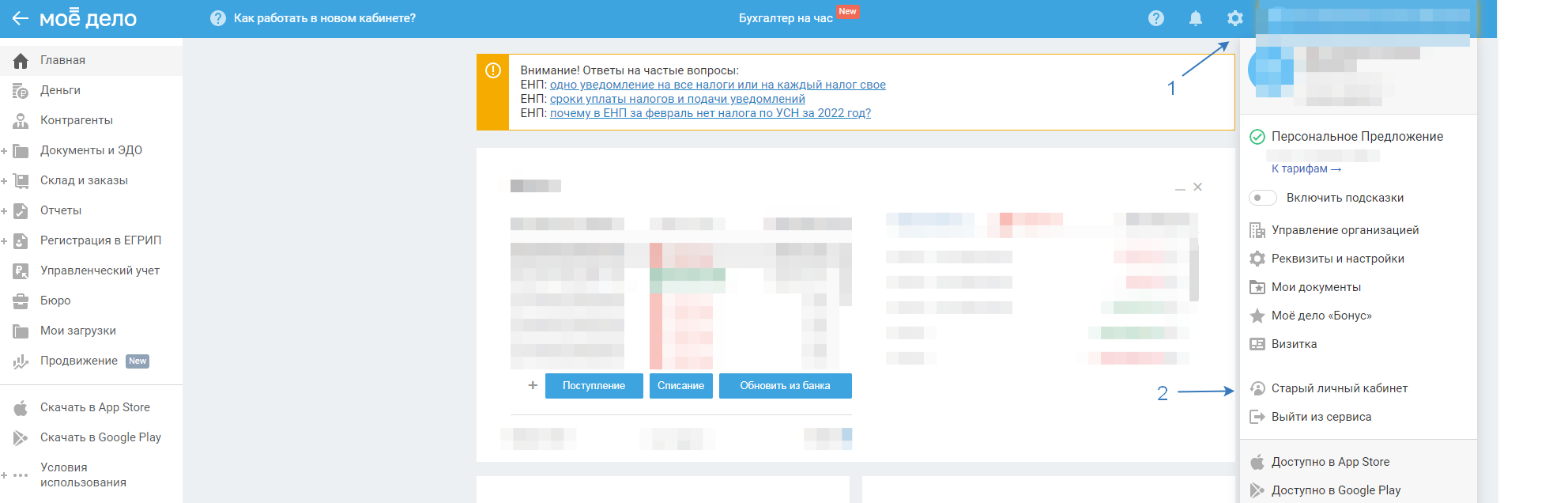 При необходимости попасть в ваш старый личный кабинет кликните на наименование вашего ИП или ООО на главной панели справа сверху. Далее в выпадающем меню кликните по «Старый личный кабинет»: