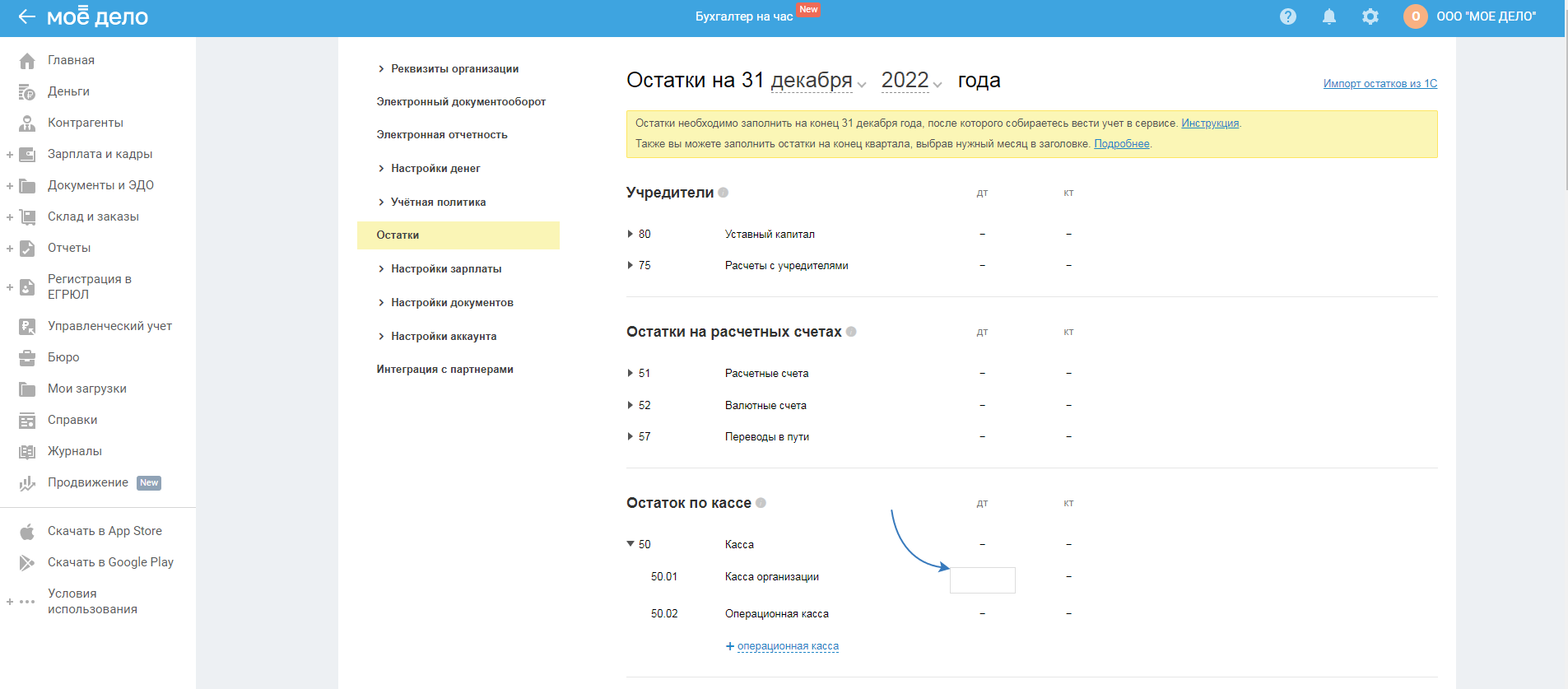 В разделе «Реквизиты» — «Остатки» необходимо отразить остаток по кассе на 31 декабря 2022 года.