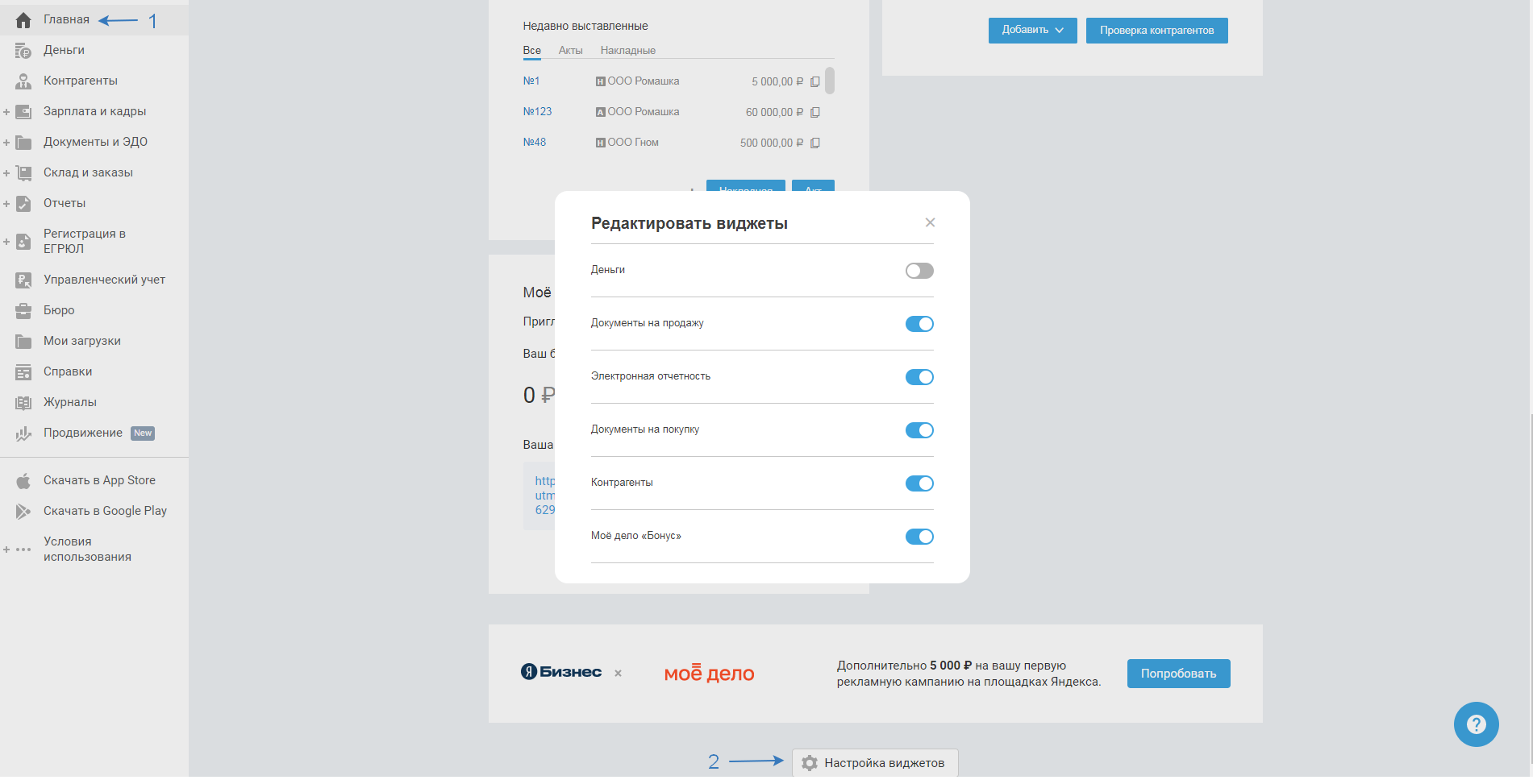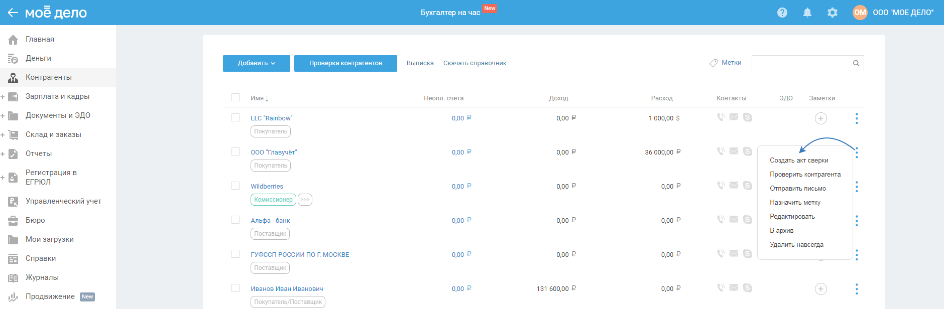- Контрагенты (и статус приглашений контрагентов по ЭДО)