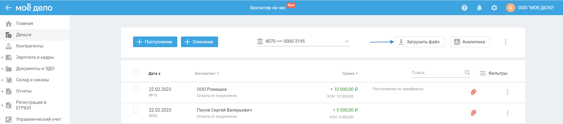 Если у вас нет в сервисе интеграции с расчётным счётом, то вы можете импортировать выписку вручную. Для этого скачайте в своем банке выписку в формате «1С» или «TXT» за 2023 год и загрузите файл в раздел «Деньги» с помощью кнопки «Загрузить файл» (подробнее в инструкции).