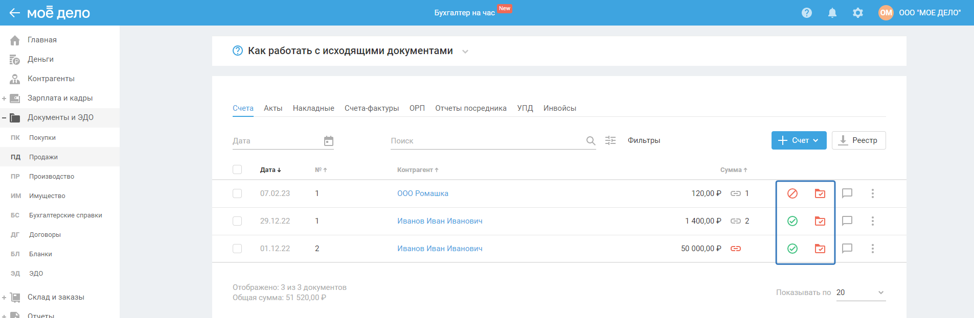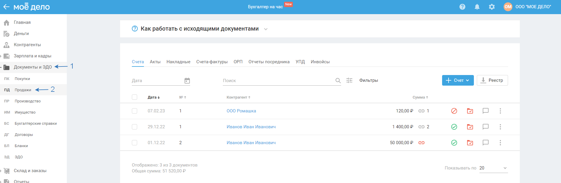 В новом личном кабинете статус счёта можно посмотреть, например, в общем списке всех выставленных счетов в разделе «Документы и ЭДО» — «Продажи»:
