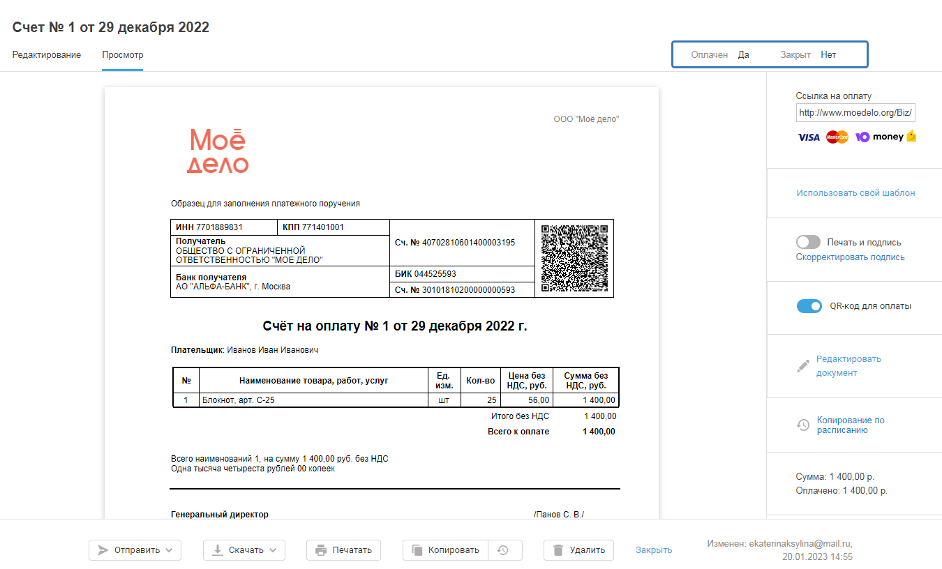 - создание собственных шаблонов счетов и актов — ссылка на инструкцию;