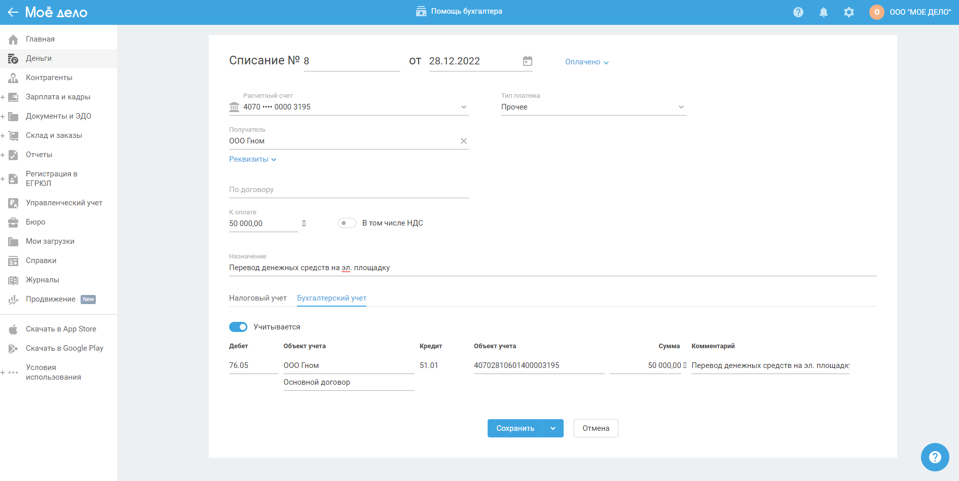 1. Перечисление средств на площадку отразите в разделе Деньги - Банк - списание с типом "Прочее", указав получателя в поле "Получатель" и бух.проводкой Дт 76.05 - Кт 51.01. Вкладку налоговый учет не заполняйте.