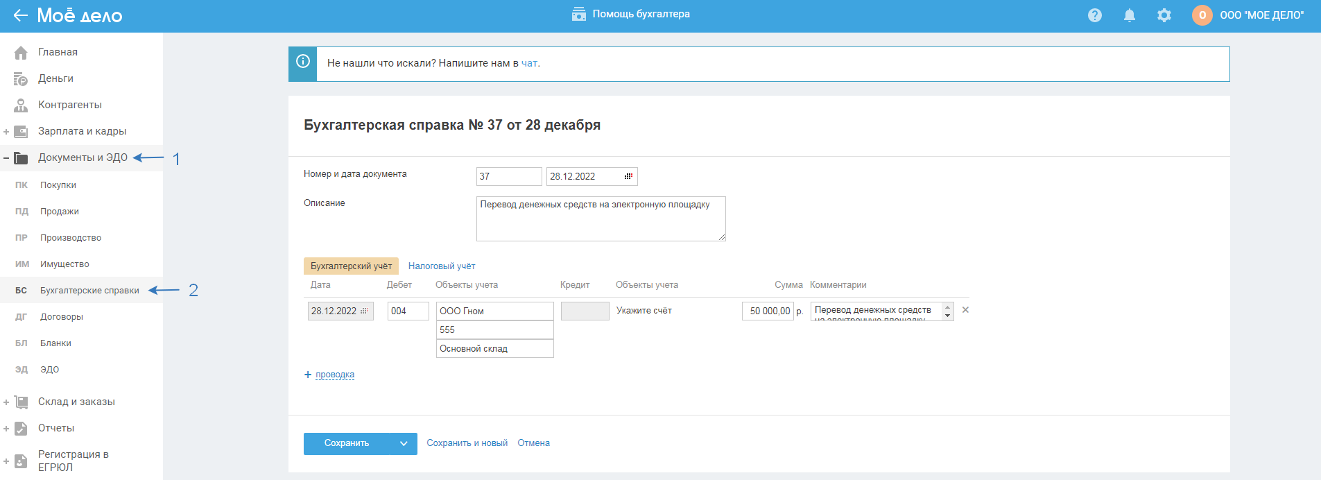 2. Выдачу обеспечения обязательств отразите бухгалтерской справкой во вкладке документы. По дате платежа, в разделе Документы, сформируйте бух. справку с проводкой по дебету забалансовому счету, например, 004 на сумму перечисленного обеспечения.
