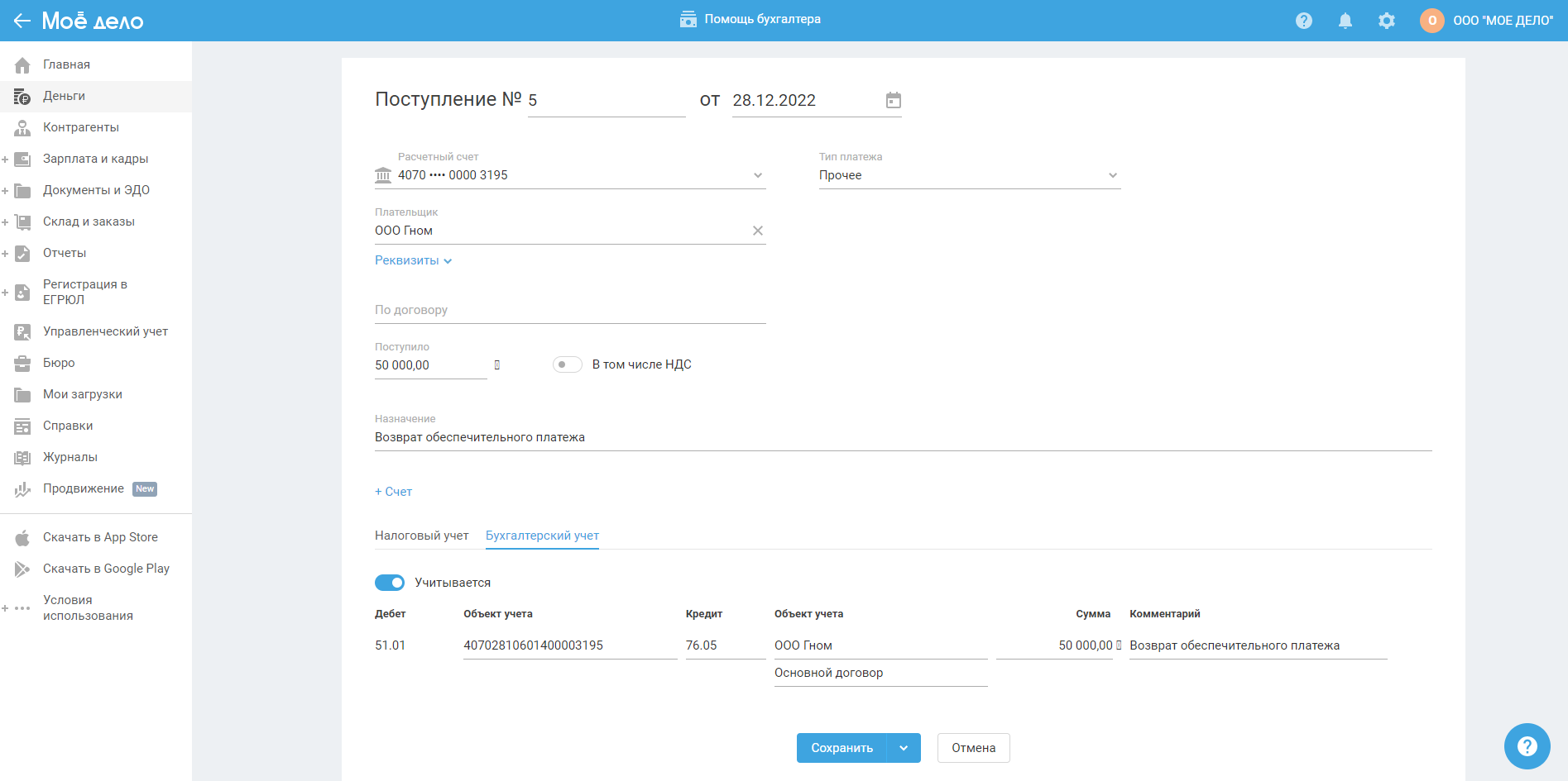 3. При возврате суммы финансового обеспечения в сервисе оформите поступление возврата оплаты также в разделе Деньги - Банк - поступление - прочее с указанием бух.проводки Д.51.01 К 76.05. Вкладку налоговый учет не заполняйте.