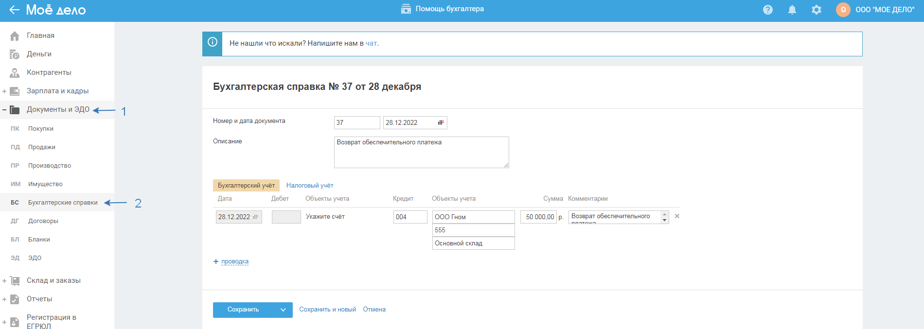 Также этой же датой отражайте в разделе Документы бух. справку, но уже по кредиту счета 004 на сумму возвращенного обеспечения. Вкладку "налоговый учет" не заполняйте.