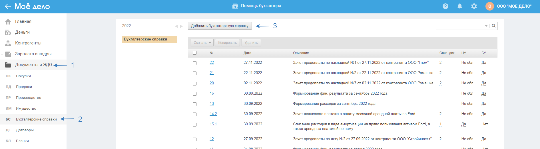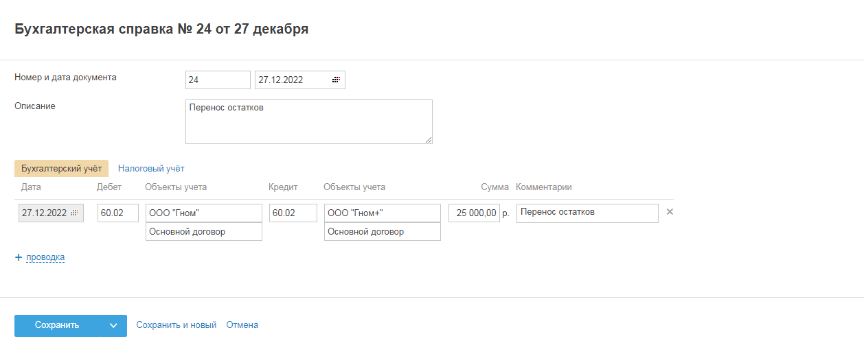 Перенести на него остаток аванса (если таковой имеется) можно будет составления в разделе Документы бух. справки с проводкой:
