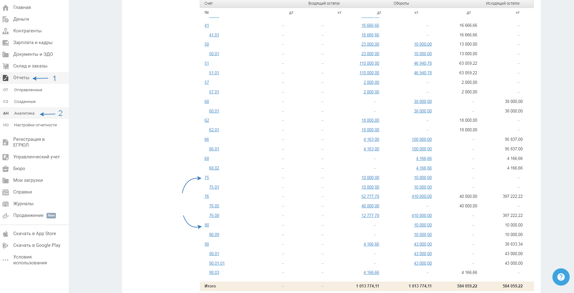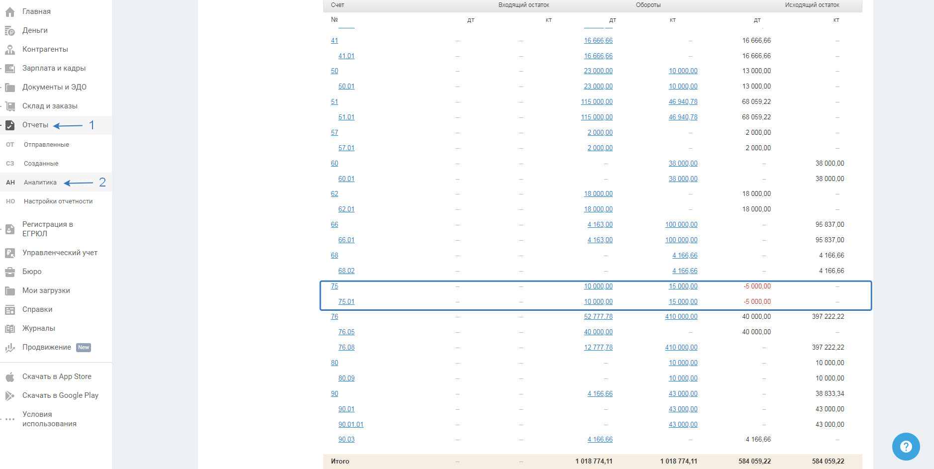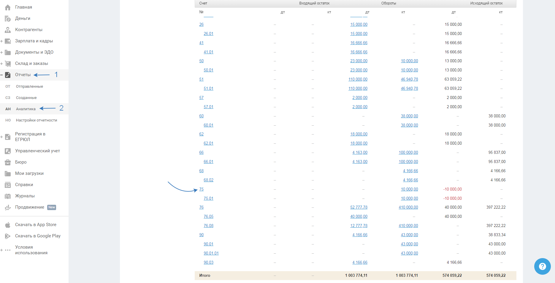 После сохранения операций в разделе "Отчеты - Аналитика" остаток по 75 счету должен быть положительный.