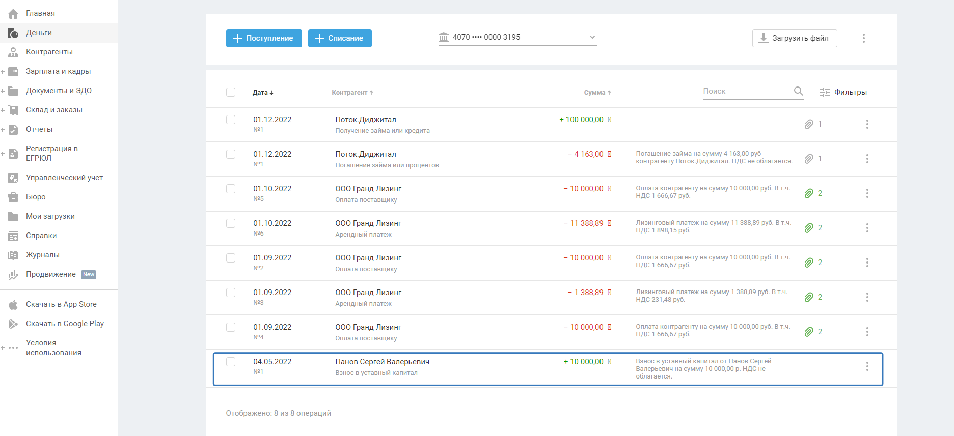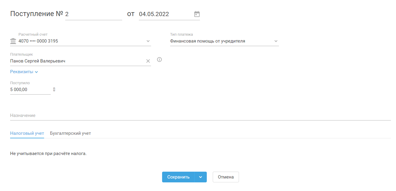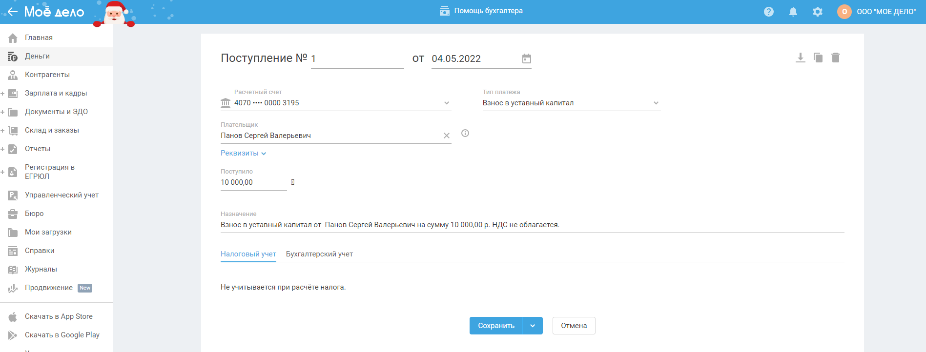 Для исправления ошибки пройдите в раздел "Деньги" , откройте операцию. Укажите в ней сумму начисленного взноса в уставный капитал, сохраните. На сумму, превышающую начисленный взнос в уставный капитал, создайте операцию "Поступление" с той же датой и номером, с типом "Финансовая помощь от учредителя" либо "Получение займа или кредита" , сохраните.