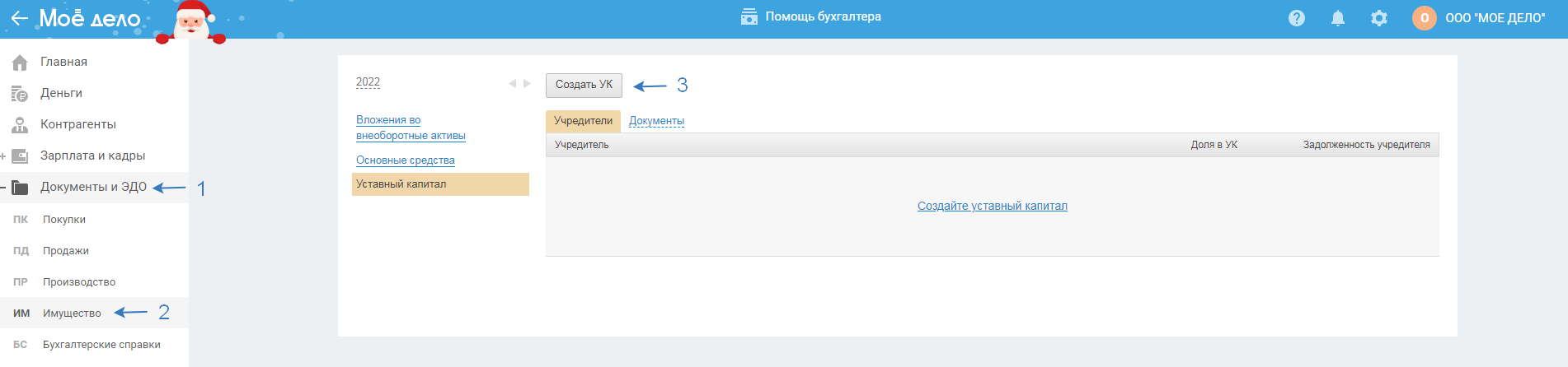 Для исправления ошибки в сервисе нужно создать уставный капитал, для этого пройдите в раздел "Документы - Имущество - Уставный капитал" , нажмите на кнопку "Создать УК" .