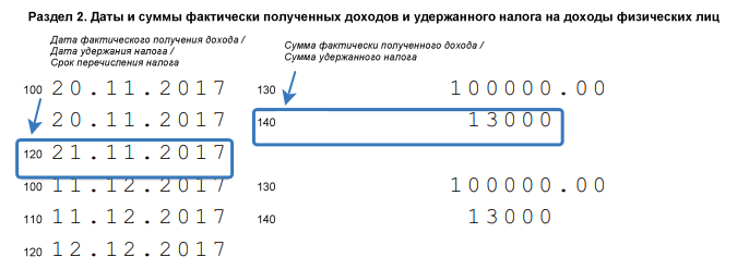 В налоговой своевременность перечисления НДФЛ определяется путем сравнения дат, указанных по строкам 120 раздела 2 и дат фактического перечисления налога по карточке расчётов с бюджетом (КРСБ).