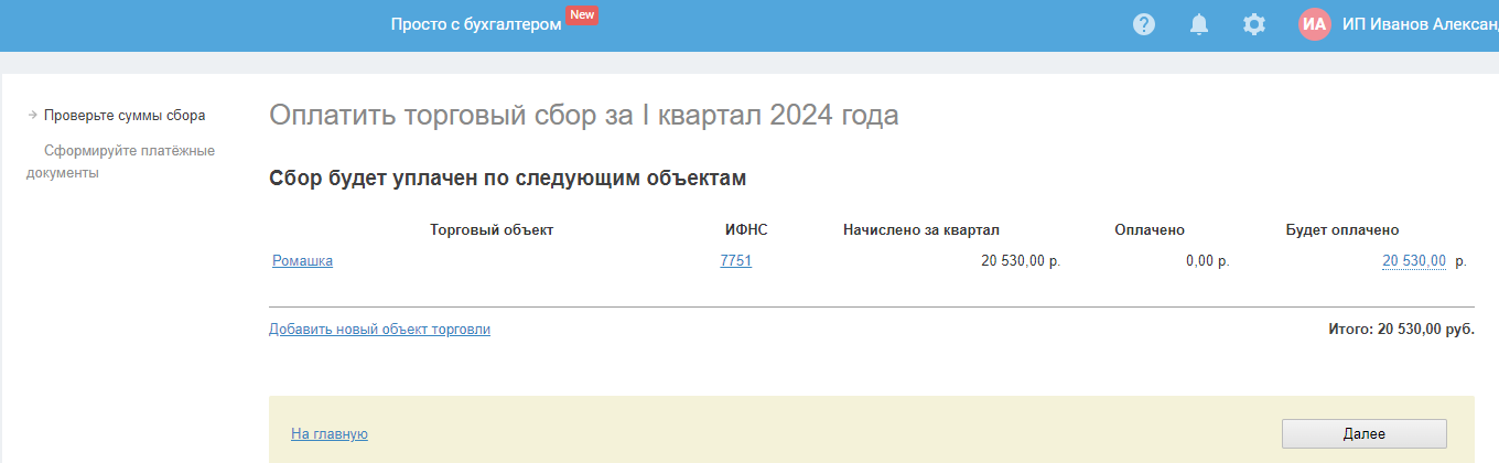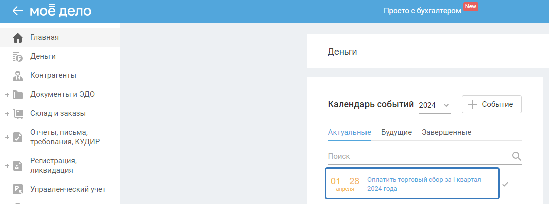 Для расчёта налога в Календаре событий на главной странице выберите «Оплатить торговый сбор за ...»: