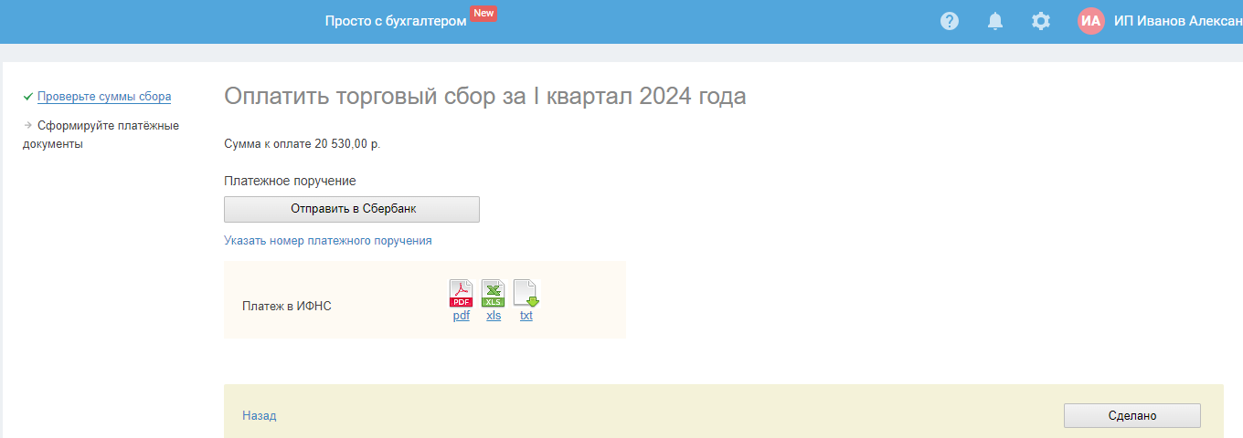 Здесь выбирается способ оплаты торгового сбора, и формируются платёжные документы.