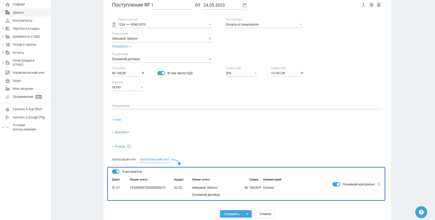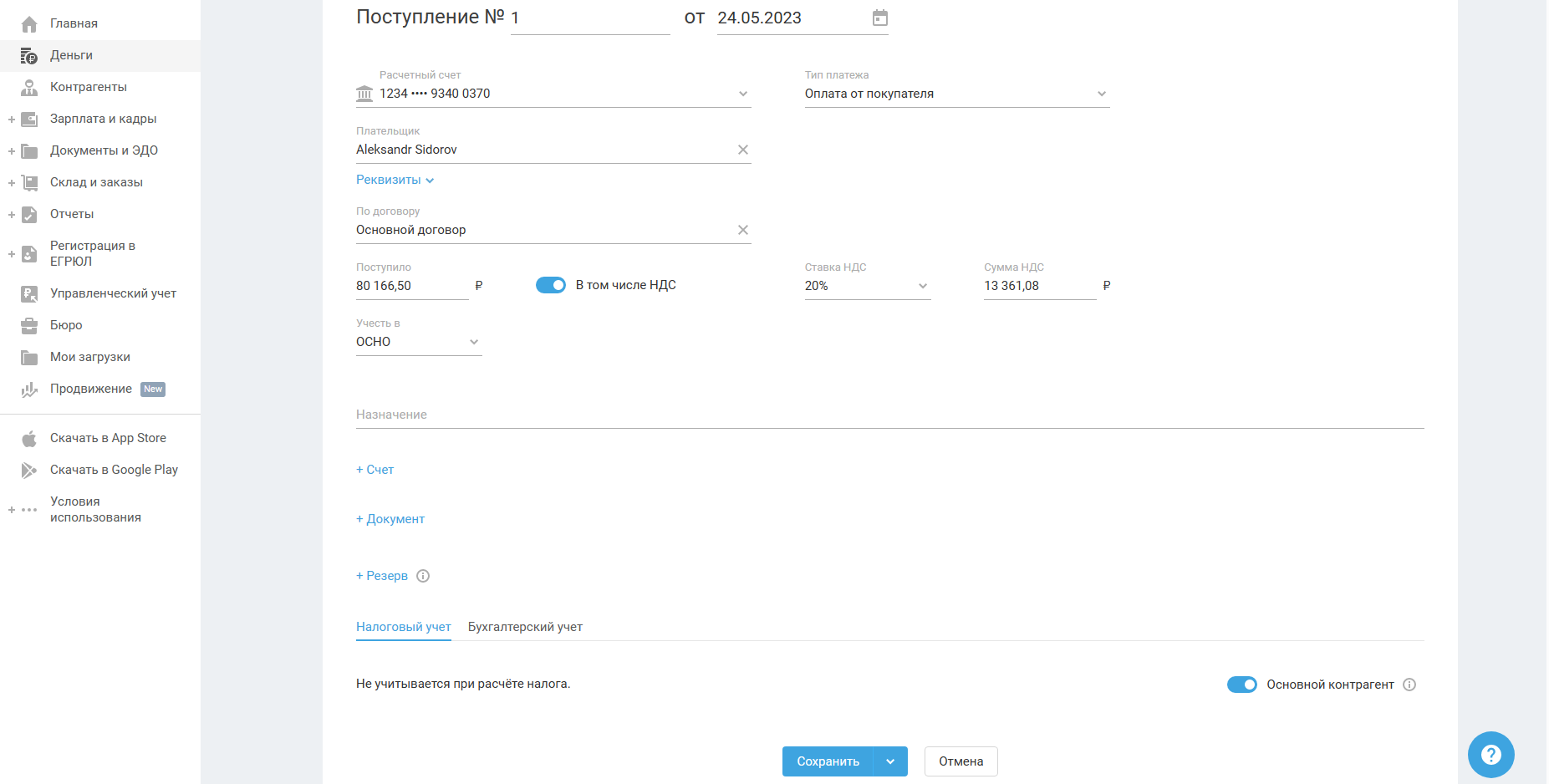 В разделе Деньги (транзитный счёт) создайте поступление с типом Оплата от покупателя и заполните поля: