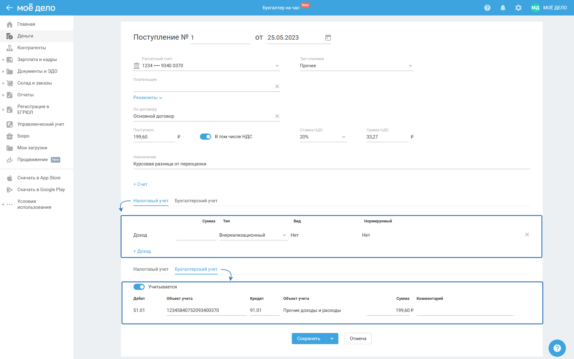 Важно. При каждом получении средств на р/сч отражайте операцию поступления, как указано выше. При этом курс ЦБ РФ вам необходимо будет отслеживать самостоятельно и вручную рассчитывать величину выручки. Автоматический пересчёт валютных средств в рубли в сервисе не предусмотрен.