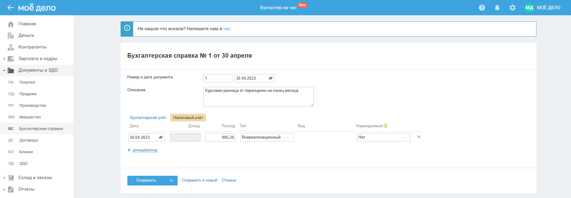 Налоговый учёт не заполняется (проставляется автоматически).