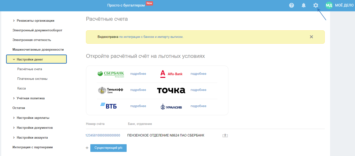 4. Затем вернитесь в личный кабинет сервиса «Моё дело», в правом верхнем углу нажмите на кнопку «Шестерёнка», после перейдите в раздел «Настройки денег»: