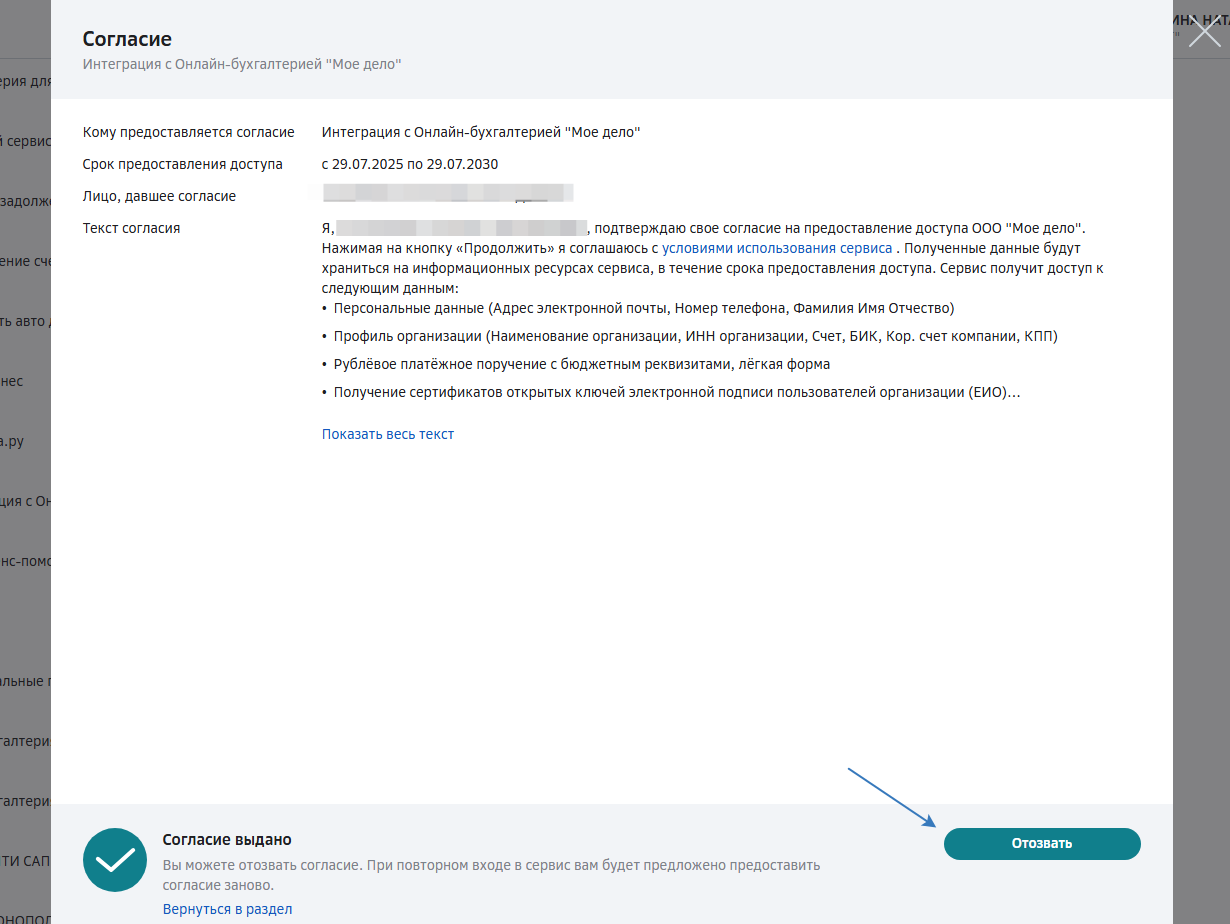 3. В открывшемся окне для отзыва согласия нажмите на кнопку «Отозвать».
