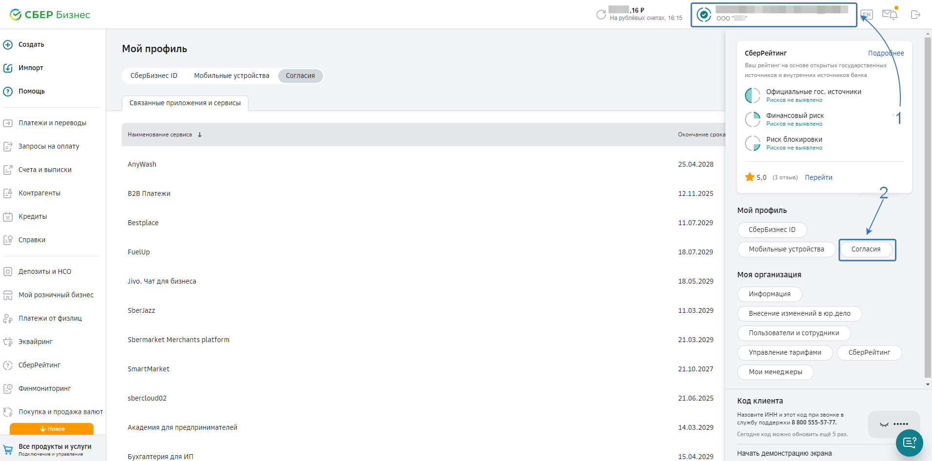 Для того чтобы переподписать согласие, выполните следующие шаги в вашем личном кабинете Сбербанк Бизнес Онлайн: