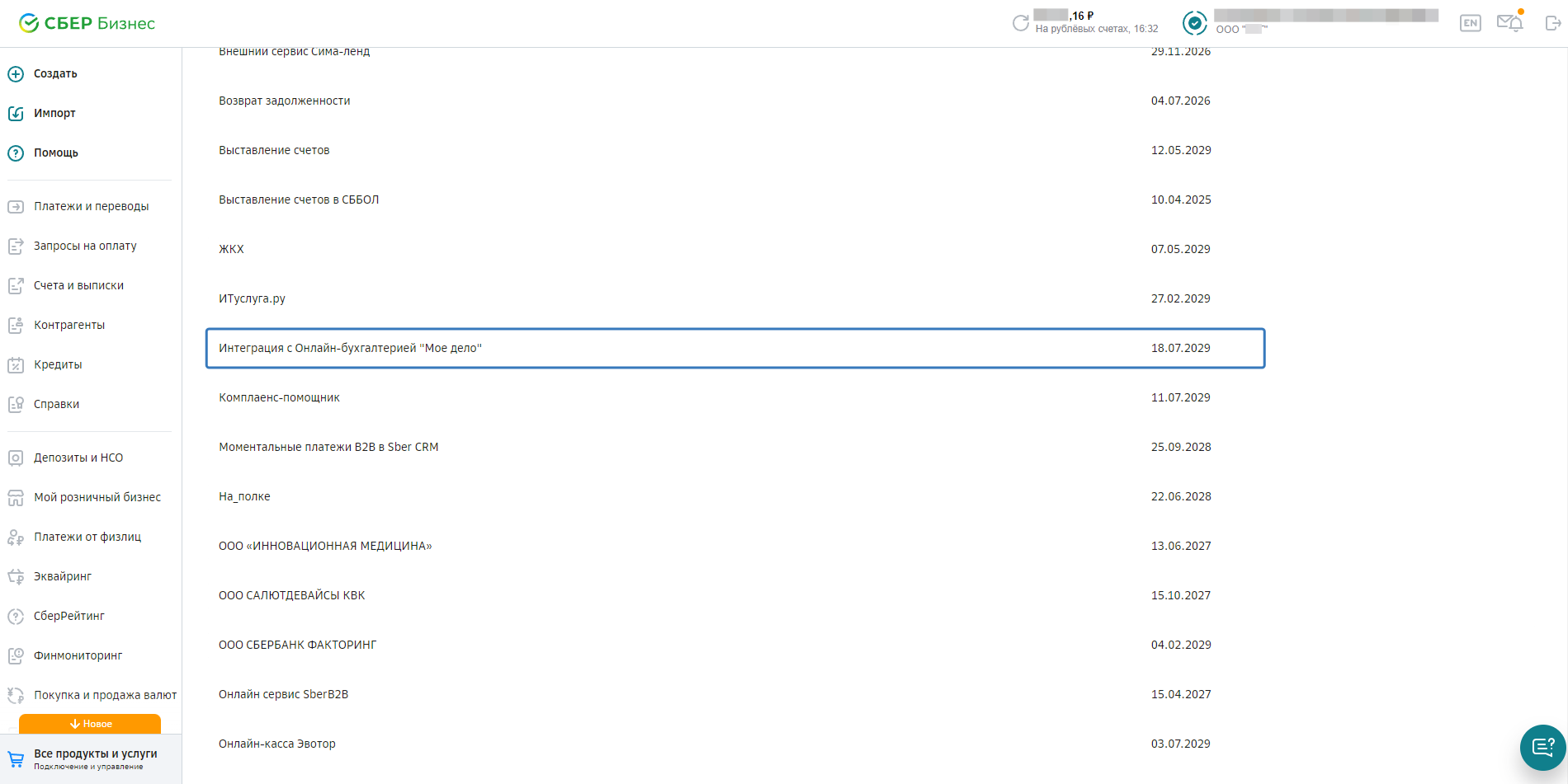 2. В открывшейся вкладке «Связанные приложения и сервисы» найдите сервис «Интеграция с Онлайн-бухгалтерией "Моё дело"» и перейдите в него: