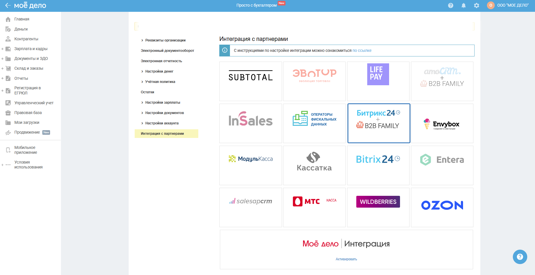 Обратите внимание. Для настройки интеграции с сервисом «Моё дело» сервис «b2bfamily» должен быть оплачен.