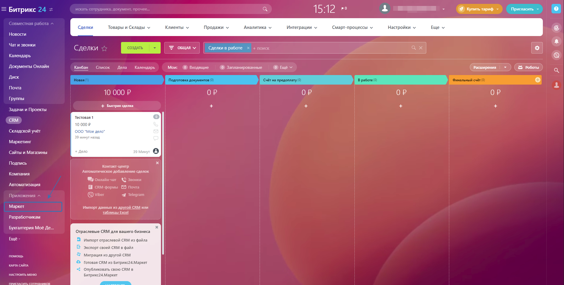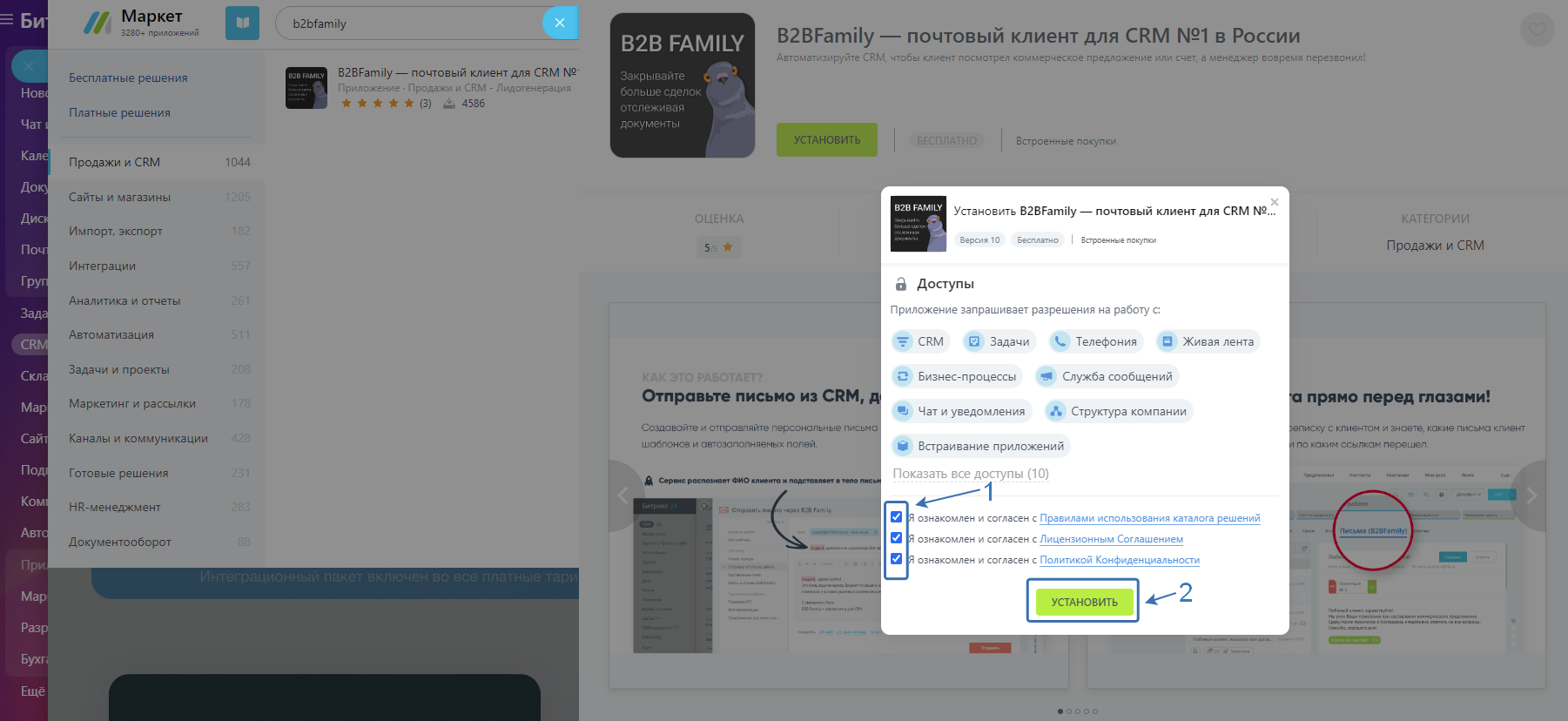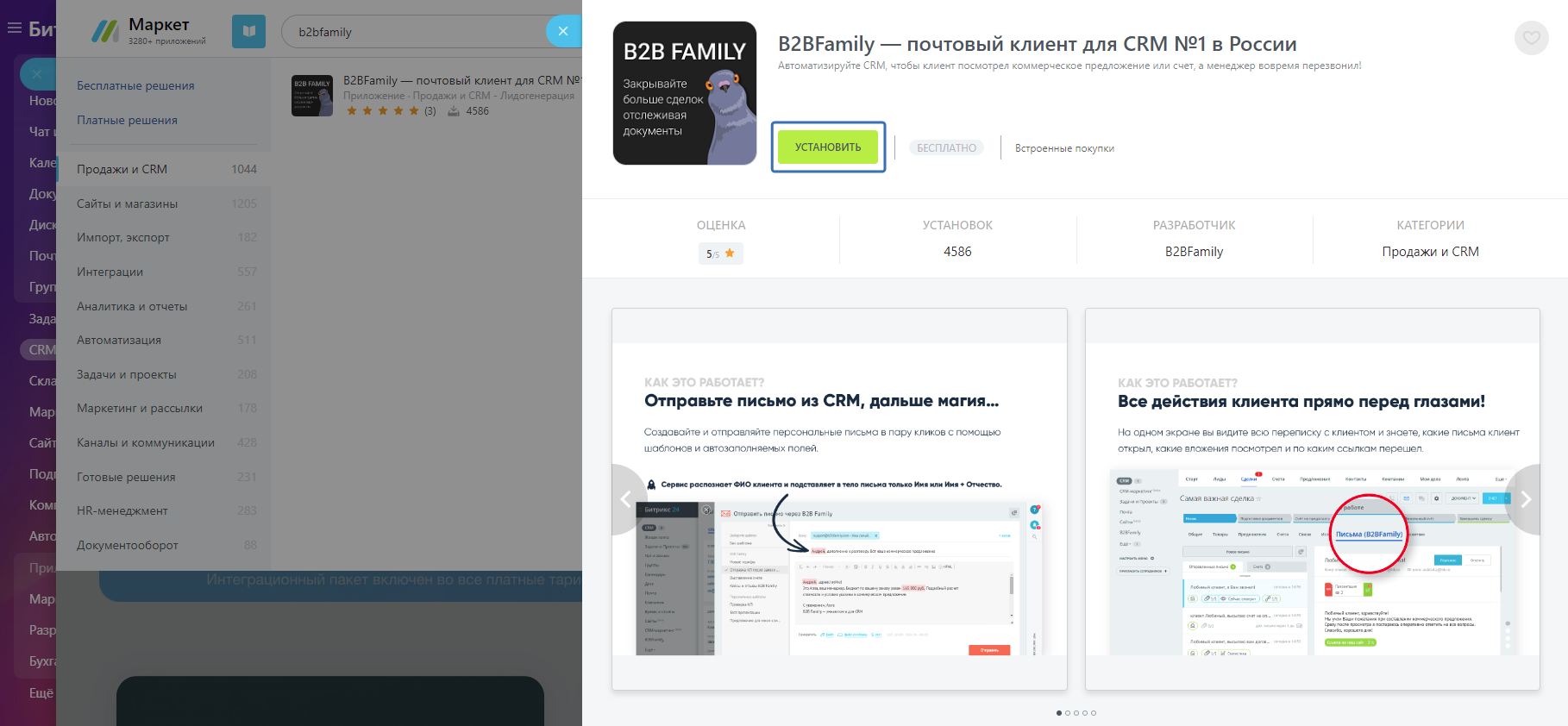 3. Затем необходимо зайти в сервис «Битрикс24» и включить виджет b2bfamily следующим образом: