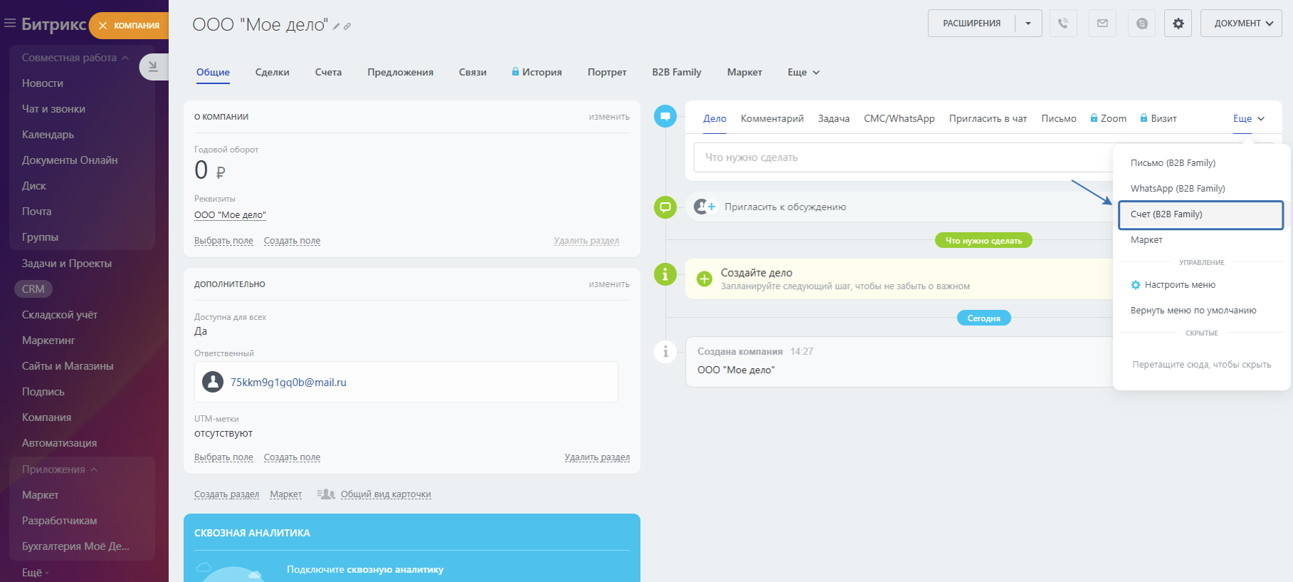 Для создания счёта вам необходимо: в карточке ЛИДа выбрать вкладку «Ещё» и нажать «Счёт (B2B Family)»: