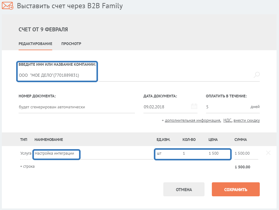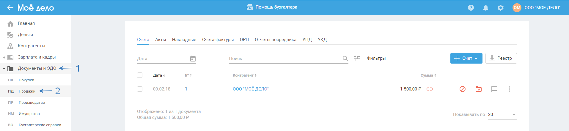 После того как вы нажмёте «Сохранить», в сервисе «Моё дело» будет создан документ счёта на оплату: