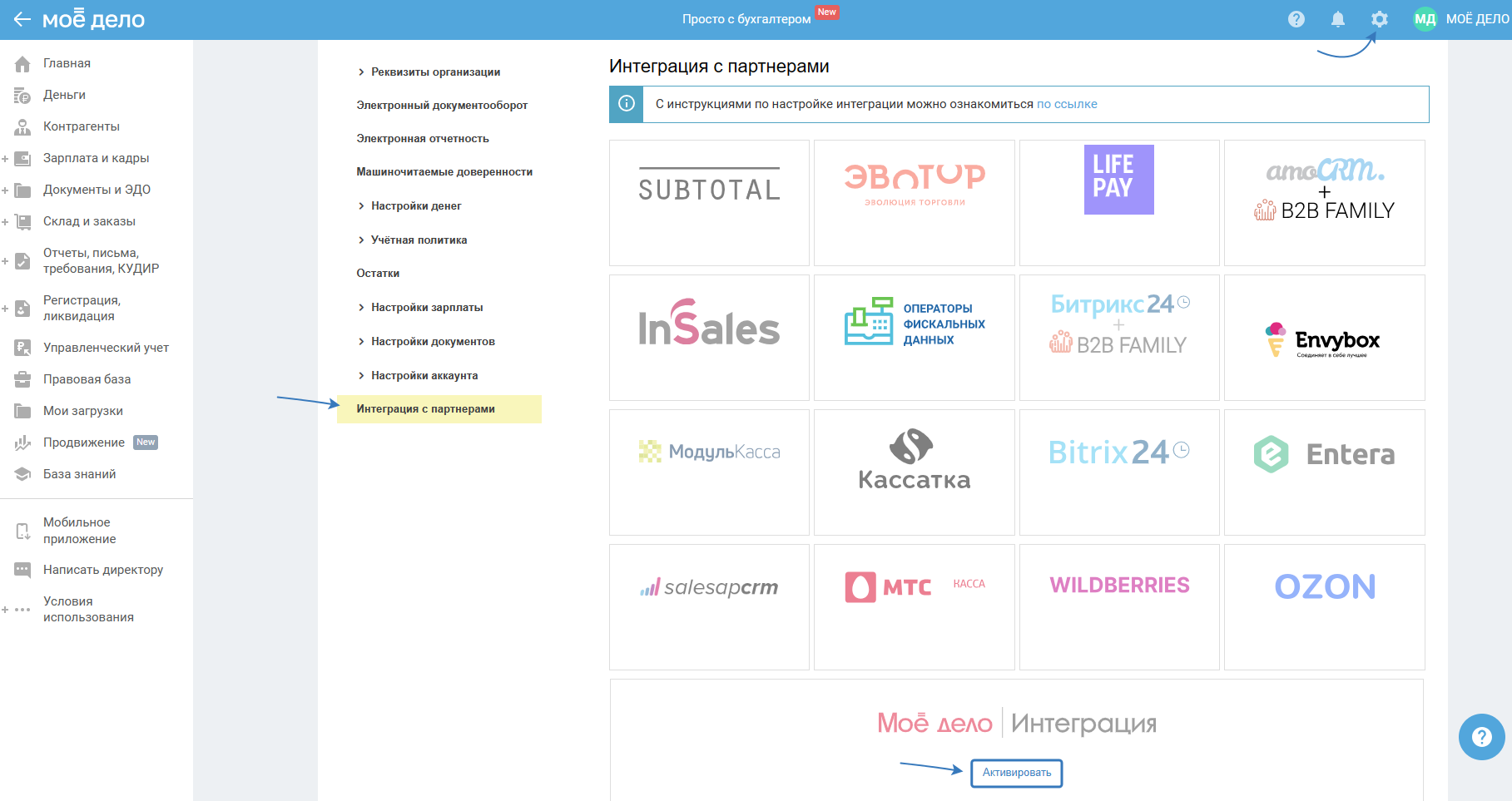 Для получения Апи ключа перейдите в раздел «Реквизиты организации — Интеграция с партнёрами» и в блоке «Моё дело | Интеграция» нажмите «Активировать»:
