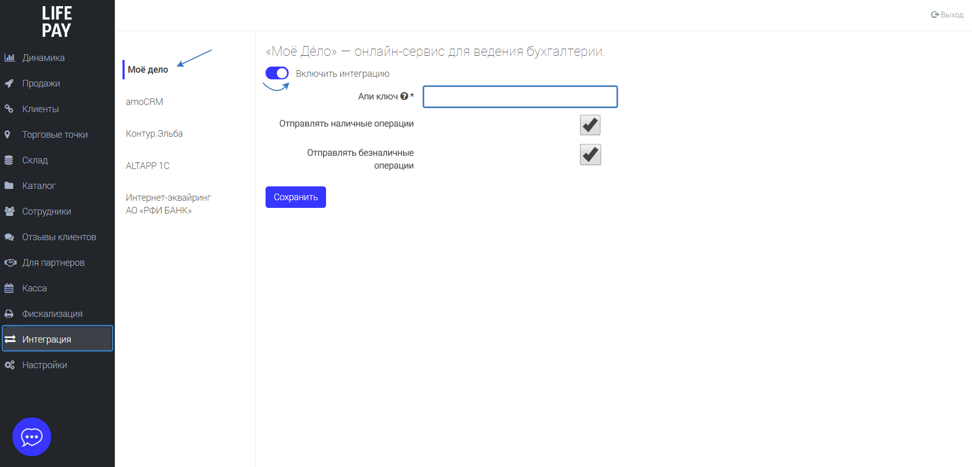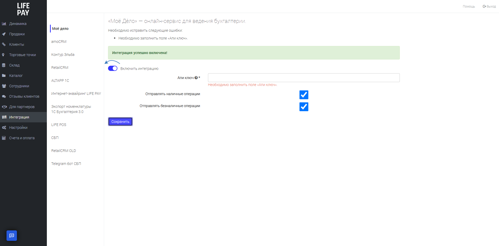 Для вашего удобства мы организовали интеграцию между сервисами Моё Дело и LIFE PAY. После включения интеграции вам будут в автоматическом режиме создаваться операции в разделе «Деньги», связанные с расходами и доходами в сервисе LIFE PAY.