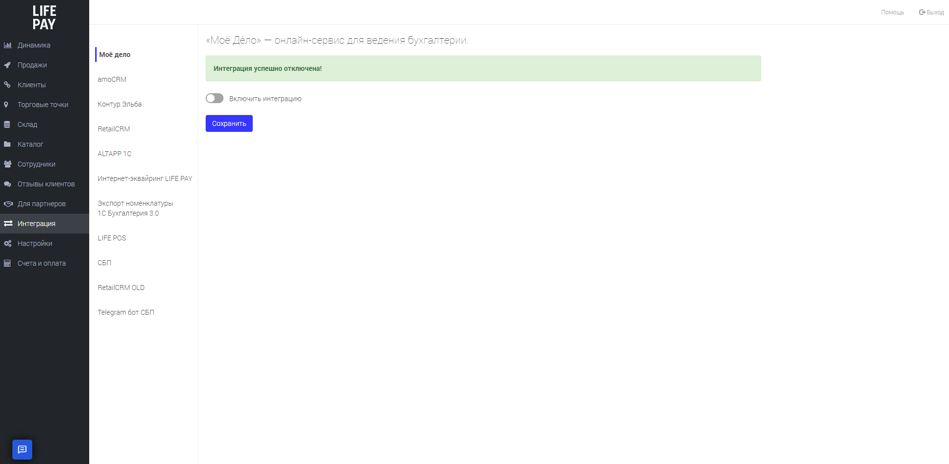 6. После успешного отключения интеграции отобразится сообщение: «Интеграция успешно отключена!»: