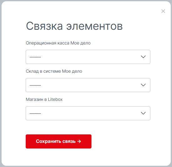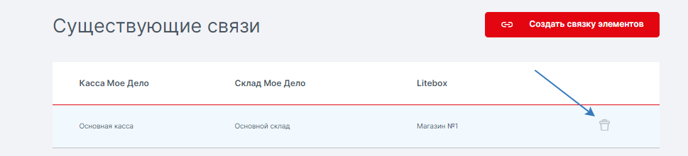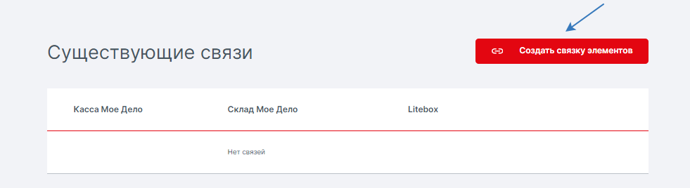 5. Кнопка Создать связку элементов — позволит связать между собой «Кассу Моё дело», «Склад Моё дело» и «Кассу МТС» для обмена данными.