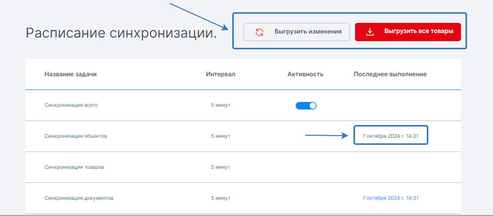- по кнопке «Выгрузить изменения» в разделе «Расписание синхронизации» осуществляется полная синхронизация;
