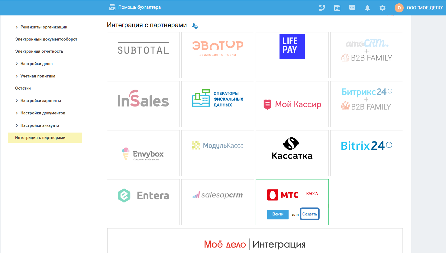 Настройка интеграции с сервисом «Моё дело»